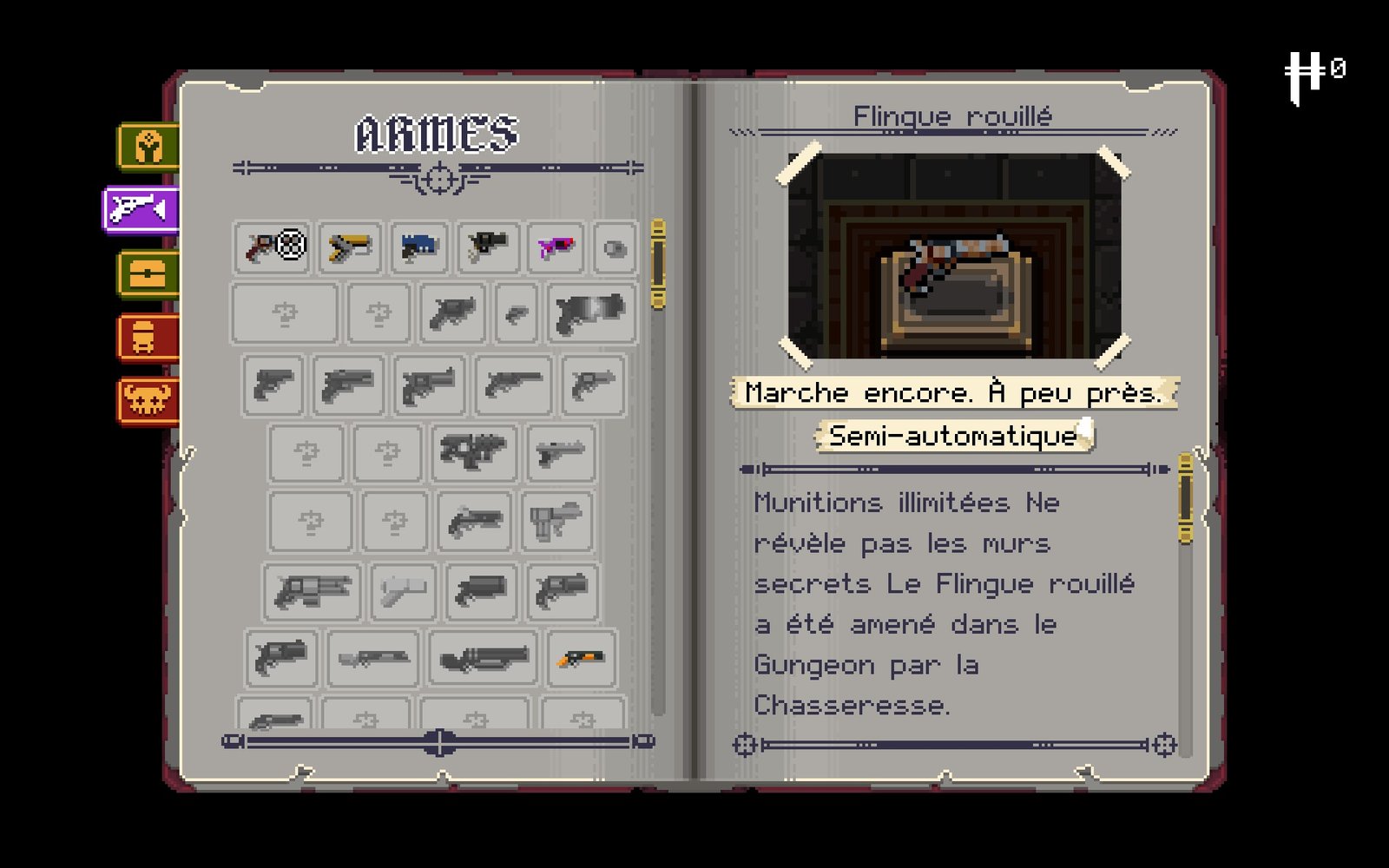 Car autant vous le dire tout de suite, le jeu est dur… vraiment dur . Comme dans n’importe quel rogue-like vous retiendrez au fur et à mesure les effets des différentes armes et objets récupérés ( une encyclopédie du jeu est d’ailleurs disponible pour vous aider, entièrement traduite en français comme l’ensemble du jeu ) et encore plus que les loots, vous devrez apprendre les patternsDésigne une séquence d'actions ou de mouvements qui se répète. Ex : attaque ou combo ennemi, une série d'événements... d’attaque des ennemis. Ici la dénomination « bullet hell » n’a pas été usurpée, l’écran sera vite rempli de boulettes , notamment durant les affrontements de boss qui vous rappelleront vos heures passées sur des shoot’em up.