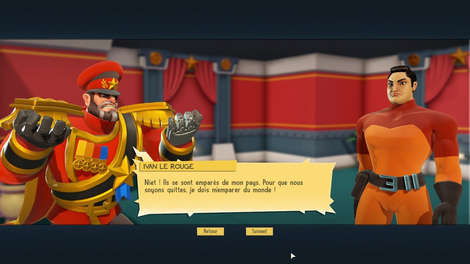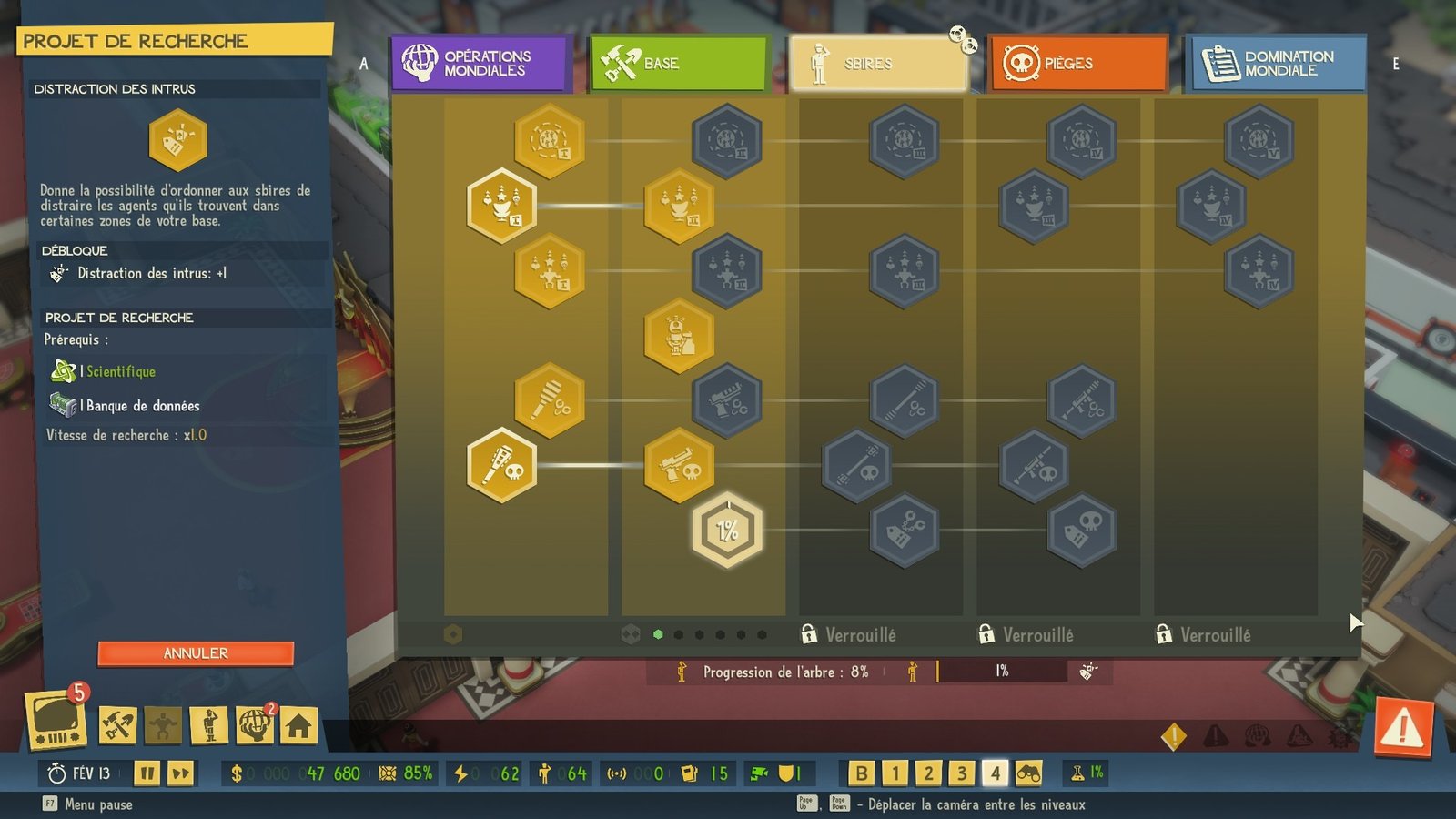Pour arriver simplement à avoir cette amélioration, qui m’éviterait de devoir micro-manager toutes les 5 minutes les gens qui arrivent sur mon île, il faut arriver au niveau 2 de l’arbre de talents, et il faut beaucoup de temps : les améliorations sont longues et doivent être faites une à une, qu’importe le nombre de machines et de scientifiques dispo. La mécanique d’agent infiltré est avant tout là pour occuper ces moments creux d’attente, en plus, on aura régulièrement des super-agents ou des espions qui débarqueront dans le but de nous voler ou juste mettre une dérouillée à votre super vilain, de quoi freiner une fois de plus votre progression (voire stopper complètement la partie). Et évidemment, les espions et super-agents n’en ont rien à faire de vos pièges ou vos portes, ils sont d’une efficacité remarquable et équipés d’un camouflage. Le constat final sera que ces rajouts de mécaniques superflus font office de cache misère et n’enlève pas le fait que, quand même, on se fait un peu chier.