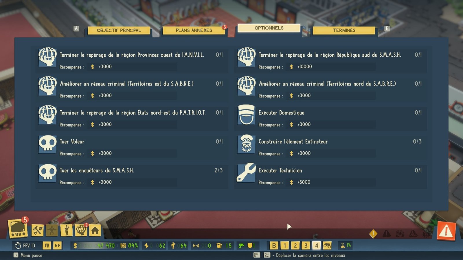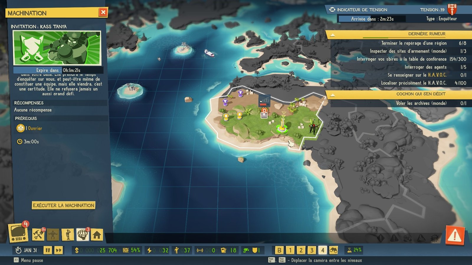 Pour construire cette arme, il va falloir des scientifiques bien sûr, des larbins par centaines pour que votre entreprise fonctionne, et un bon gros paquet de fric, en lingots d’or de préférence. Pour gagner de l’argent, votre moyen principal sera de faire des machinations, qui permettront d’en générer sur une durée déterminée, au détriment de la perte de larbins, plus ou moins spéciaux suivant le type de mission, et de l’augmentation de la tension dans la région du monde concernée. Il y aura, bien évidemment, des objectifs secondaires qui donneront un peu de pognon eux aussi, mais rien sur le long terme. Dès le début, on rentre rapidement dans de longues sessions de « farm » intensif, où vous allez devoir conquérir une région, faire des machinations, réduire la tension et tout recommencer. Des améliorations vous permettront d’optimiser tout ça, mais plus on avance, plus le temps et le fric nécessaire à améliorer votre base devient long et chiant, comme si les stigmates de la version FarmVille et Free To Play étaient encore là.