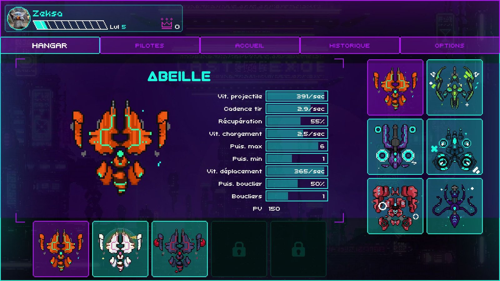 Le choix du pilote et du méca n’est pas anodin. Les trois héros possèdent des capacités passives spécifiques (vitesse des projectiles augmentée lorsque la balle se trouve dans la moitié adverse, cadence de tir augmentée quand le robot n’a plus de bouclier, vitesse de déplacement augmentée après avoir perdu un bouclier, etc.). Les six mécas ont quant à eux des statistiques différentes (puissance, nombre de boucliers, points de vie, vitesse des projectiles…). À vous de tester les différentes combinaisons pour trouver ce qui vous correspond le mieux.