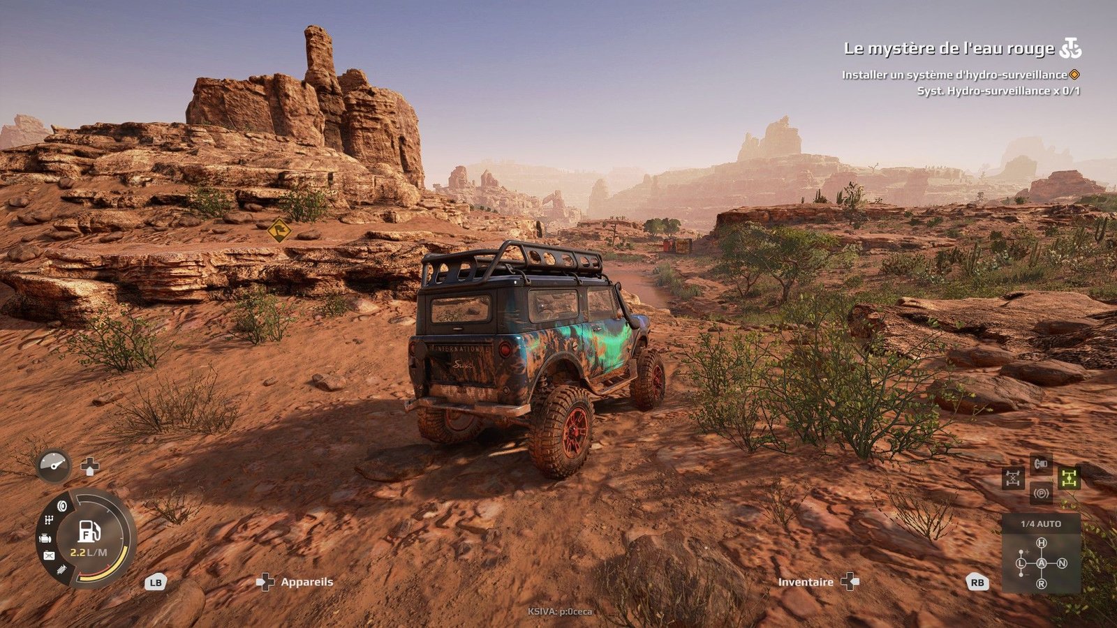 Il y a également tout un tas d’activités proposées à côté de la conduite, comme des phases d’analyse de zone à l’aide du drone, des prises de vue avec l’appareil photo en zoomant et en réglant correctement le focus, et bien sûr dresser et faire évoluer son camp avec diverses structures permettant par exemple de fabriquer ou de stocker de l’équipement. Celui-ci doit en effet être acheté au départ avant de lancer la mission, mais, une fois consommé, il reste la solution de recourir à ce stratagème pour se ravitailler, à moins de trouver des points de largage proposant diverses choses et en particulier du carburant pour éviter de se retrouver à sec. Parmi les gadgets high-tech, en dehors du drone et des jumelles, on peut d’ailleurs s’équiper d’un détecteur de métal pour trouver plus facilement les caches. Un écho sondeur permet également de tester la profondeur de l’eau avant de s’y engager afin d’éviter les mauvaises surprises. Encore une aide non négligeable pour ne pas se retrouver coincé. Le garage est le lieu dédié à l’équipement des camions et à leur customisation (peinture, autocollants, pare-buffle, jantes…) comme à leur amélioration avec plus de 200 éléments dans cinq catégories : moteur, boîte de vitesse, suspensions, pneus et treuil.