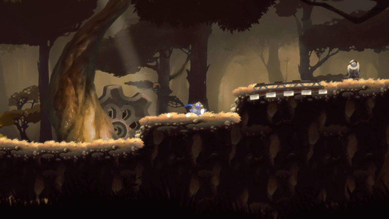 Après une introduction sous forme de dessin animé, Fledge prend la forme d’un jeu de plateforme en 2D avec scrolling horizontal réalisé sous Unity. Avec son ambiance bon enfant, il s’avère séduisant dans sa forme comme dans son fond. Il demande en effet toute la dextérité qui va avec un jeu de plateforme, mais il n’est pas que cela, car il faut aussi trouver comment franchir chaque passage et/ou atteindre chaque item. En cela, il revêt un aspect de puzzle game. Chaque échec se solde par une mort et il faut alors retenter sa chance à partir de la dernière pierre de sauvegarde qui s’active automatiquement lorsque l’on passe devant. Et préparez-vous à mourir souvent, car on est là face à un pur die & retry. Il y a même un bouton pour se faire exploser lorsque tout espoir est perdu et que l’on se retrouve coincé.