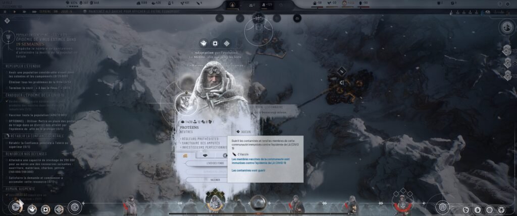 Je n’ai pas de solution miracle ni d’explication sur le problème lié à ce scénario, mais si le Doomsayer n’apporte pas vraiment quelque chose de révolutionnaire (c’est juste une faction en dehors de vos guildes, avec laquelle on ne peut vraiment négocier), la présence d’une épidémie aurait rajouté un vrai plus dans un jeu comme Frostpunk 2. Il faudrait juste une gestion intelligente de la propagation (qui doit se réduire à mesure qu’on vaccine les gens), ainsi que des dispositifs disponibles à l’écran. On a la possibilité de faire des contrôles de santé ou des expérimentations au pied levé (avec les bonnes améliorations) pour améliorer les recherches, mais il n’y a aucune réelle possibilité d’aménager le fonctionnement des districts touchés (genre, au hasard, un confinement, qui ralentirait la propagation mais aussi la production du district). La préparation du-dit vaccin aurait dû avoir son propre bâtiment mais on le trouve dans les districts industriels sans vraiment de raison. Mais surtout, aucune nouvelle loi n’existe pour ces deux scénarios, ce qui donne toujours cette sensation désagréable de DLC bancal. Comme si les rajouts n’avaient été qu’un empilement et non une implémentation.