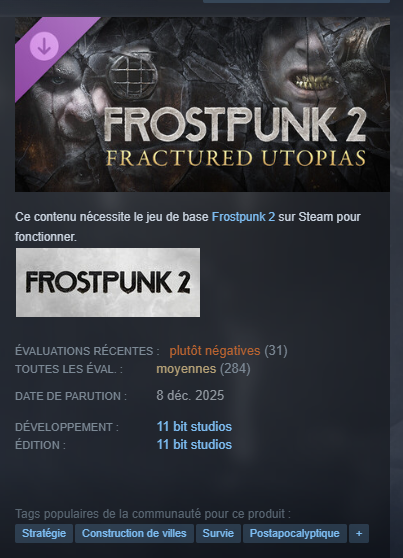 Il y a un peu plus d’un an, je vous parlais de Frostpunk 2, et de son passage en jeu de gestion axé avant tout sur la politique. C’était très bien (il avait même reçu une sélection GSS !) et 11 bit Studios avait prévu de sortir Fractured Utopia, le premier DLC qui devait viser à étoffer la gestion des factions mais aussi à rajouter un peu de scénarios spécifiques.