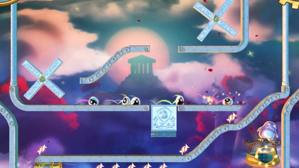 Un ou plusieurs Furmins sortent à un point A et il faut les emmener jusqu’à un point B en déplaçant des éléments ou en activant à temps d’autres et en tenant compte de la gravité. Rien d’extraordinaire mais la scène est plutôt jolie, les commandes répondent bien et les niveaux s’enchaînent sans trop de difficulté bien qu’il ne soit pas aisé d’obtenir tous les items bonus de score et de temps. Là également rien d’original puisqu’il s’agit d’un gameplayOu « jouabilité » en français, fait référence à la façon dont le joueur interagit avec un jeu vidéo. académique du genre. Quels défauts trouver alors à ce jeu qui respectent bien les canons du genre ? Pas grand chose à vrai dire et pourtant pour être direct, je n’aime pas du tout ce jeu et je n’y rejouerais sûrement jamais une fois ce test publié. A titre purement personnel, il ne m’apporte rien de ce que je viens chercher dans un jeu vidéo mais…