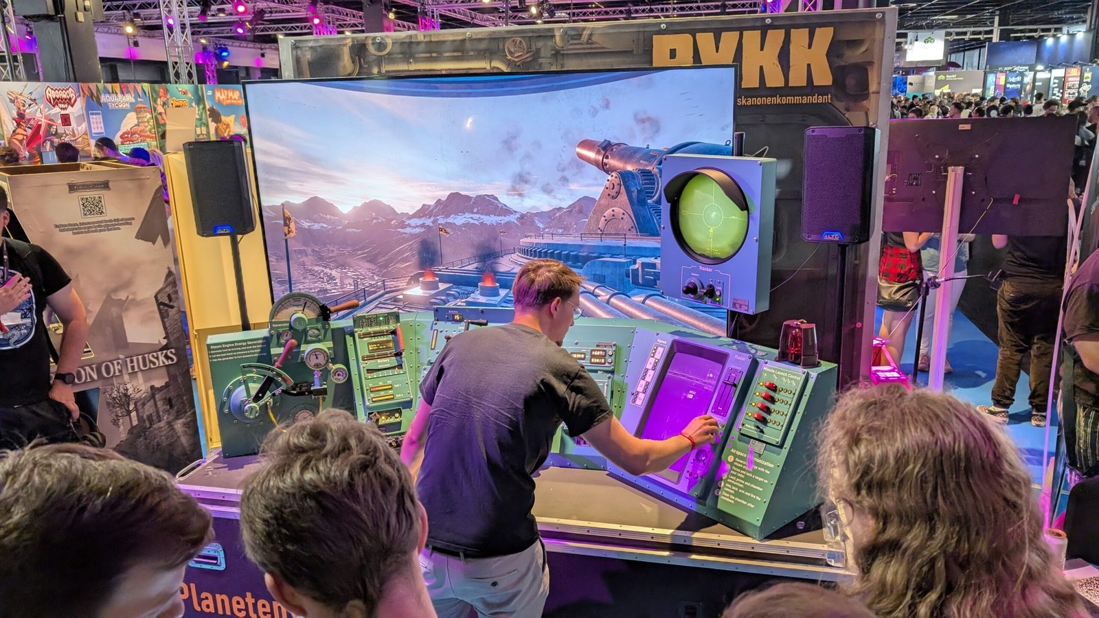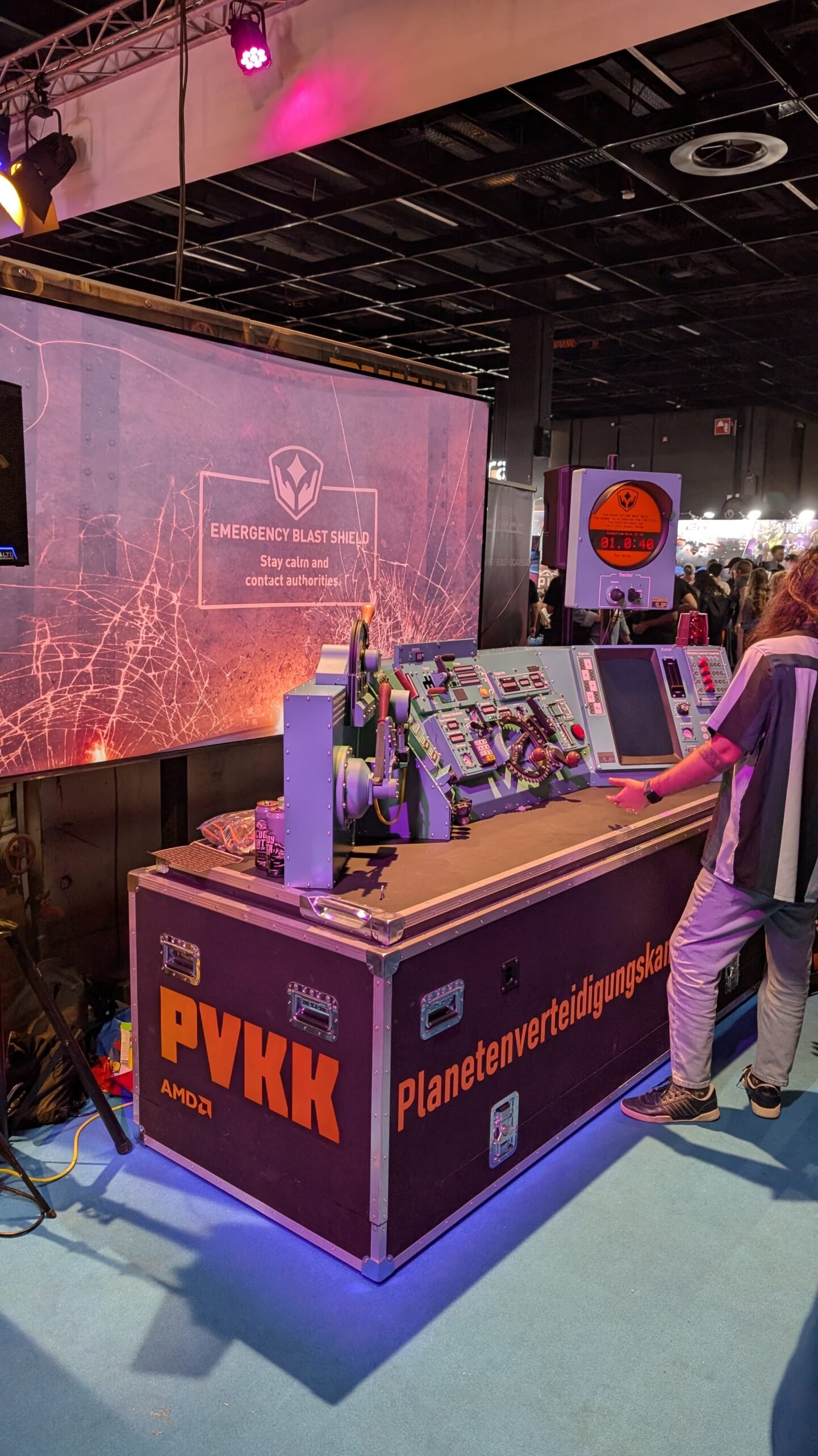 Avant mon premier rendez-vous de la journée, je passe devant le stand impressionnant de Planetenverteidigungskanonenkommandant (ou PVKK), sur lequel un tableau de bord gigantesque de canon galactique fonctionnel était présent. Entre son coup de projo lors de l’ONL et le côté tape à l’œil de ce stand, il avait forcément beaucoup de succès et, sans rendez-vous, il était compliqué d’y jouer sans attendre plusieurs heures (je vais beaucoup passer devant sans jamais pouvoir y toucher).
