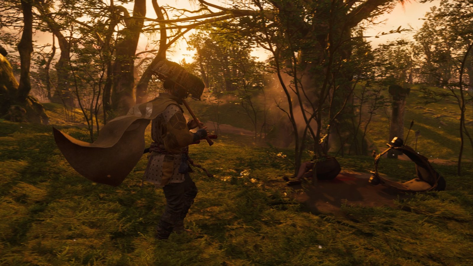 Si des japonais le disent, qui serais-je pour remettre en cause leur parole. Ghost of Tsushima semble en tout cas plutôt authentique dans la minutie de sa reproduction d’un pays très différent de celui de ses développeurs, dans une vision néanmoins très romancée que cela soit visuellement, narrativement et structurellement. S’y côtoient avec une étrange facilité tous les climats dans une certaine exagération poétique, le temps pouvant passer d’un orage inquiétant aux charmes d’un ciel ensoleillé dont les rayons de lumière nous aveuglent parfois de leur intensité. La beauté de ses couleurs se marrie bien avec ce qui les anime. Le vent souffle régulièrement courbant l’échine à la flore, tandis que les effets de particules abondent en s’exprimant sous la forme de lucioles, de pluie ou de feuilles tombantes réagissant à notre passage.