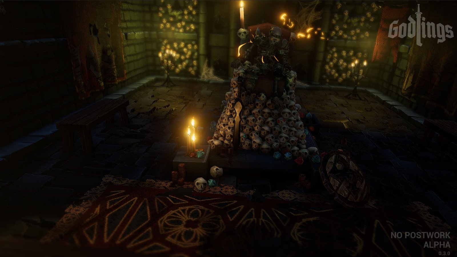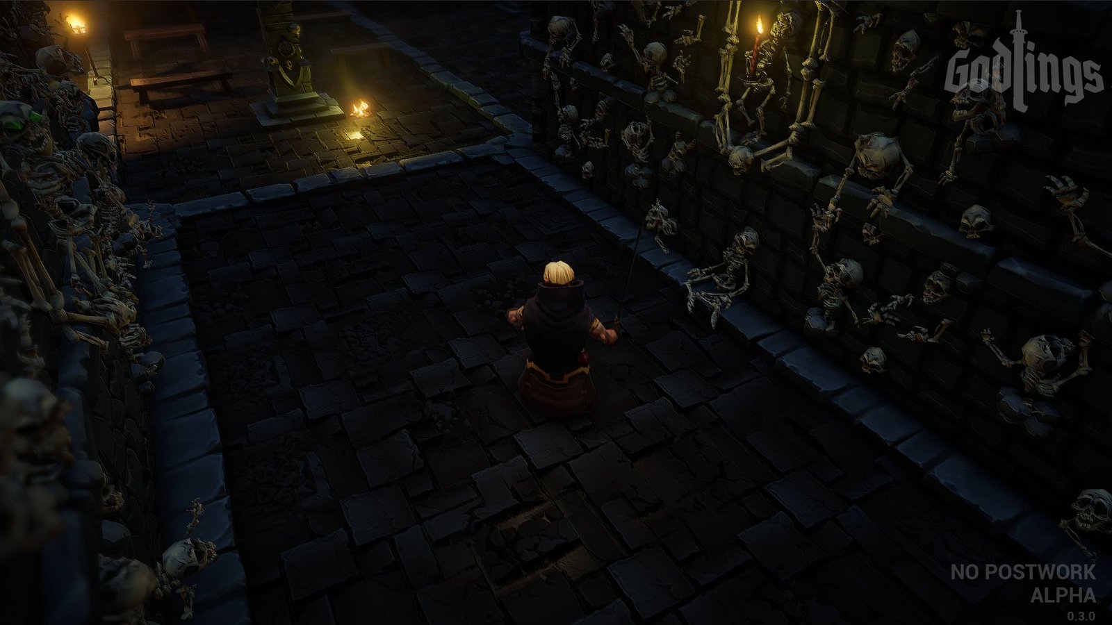 Dans un univers médiéval fantastique, le joueur sélectionne tout d’abord un personnage en fonction de sa classe. On y retrouve les poncifs du genre avec un assassin, un prêtre, un guerrier et un mage, pouvant chacun devenir de gros bourrins. Mettre une hache à 2 mains dans les délicates mimines de votre mage est totalement possible dans Godlings, le studio assumant l’aspect brutal du titre. D’ailleurs ils ne s’enquiquine (oui j’utilise des mots presque mignons parfois) pas avec un scénario, on est là pour tabasser du streum (oui, oui j’ai bien dit streum, comme dans les années 90) et pas pour autre chose. Le jeu est dur, les niveaux générés aléatoirement, le jeu est dur, les ennemis ont chacun un comportement différents, des squelettes débiles qui vous oublient une fois hors de l’écran, aux bestioles géantes qui vous poursuivront jusqu’à la mort (la leur ou la vôtre). Ah au fait, je vous ai dit que le jeu était dur ?