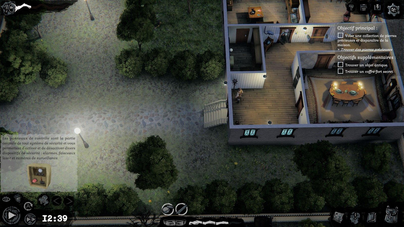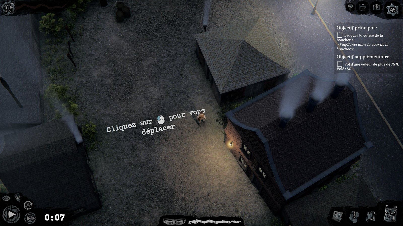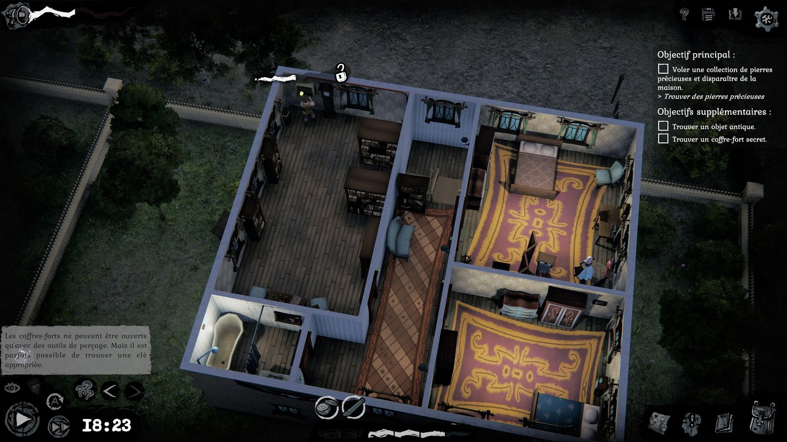 En vue de dessus, dans un environnement gris et terne, on visite des petites cartes avec différents objectifs, parfois de nouvelles quêtes viennent se greffer en cours de mission, mais cela reste relativement rébarbatif dans les mécaniques. Il faut trouver la bonne fenêtre à forcer, ou la bonne porte à crocheter, éloigner éventuellement des gardes ou autre habitués des routines de « je tourne en rond pour rien », essayer de ne pas faire trop de bruit (ou, du moins, loin des oreilles attentives). On pourrait penser tenir un petit jeu sympa d’infiltration à la Thief, mais c’est sans compter des choix très discutables de game designProcessus de création et de mise au point des règles et autres éléments constitutifs d'un jeu.