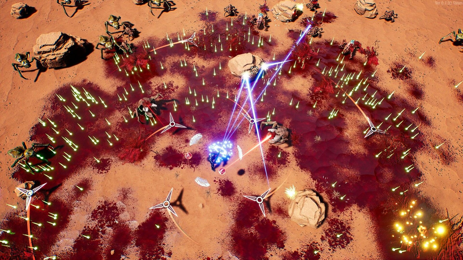 La prise en main est très bonne et le jeu laisse le choix entre tir automatique et manuel. Sachant que la gestion de la surchauffe de l’arme est importante, je ne peux que vous conseiller de jouer en manuel, en plus c’est plus amusant de viser les ennemis ! Outre la survie pure, des bonus seront parfois à récupérer pour glacer l’écran entier ou avoir une cadence de tir monstrueuse, il y aura également une ressource spécifique à collecter, ainsi que divers objectifs à accomplir : utiliser x fois une compétence, tuer x ennemis, faire x dégâts avec une arme précise, etc.