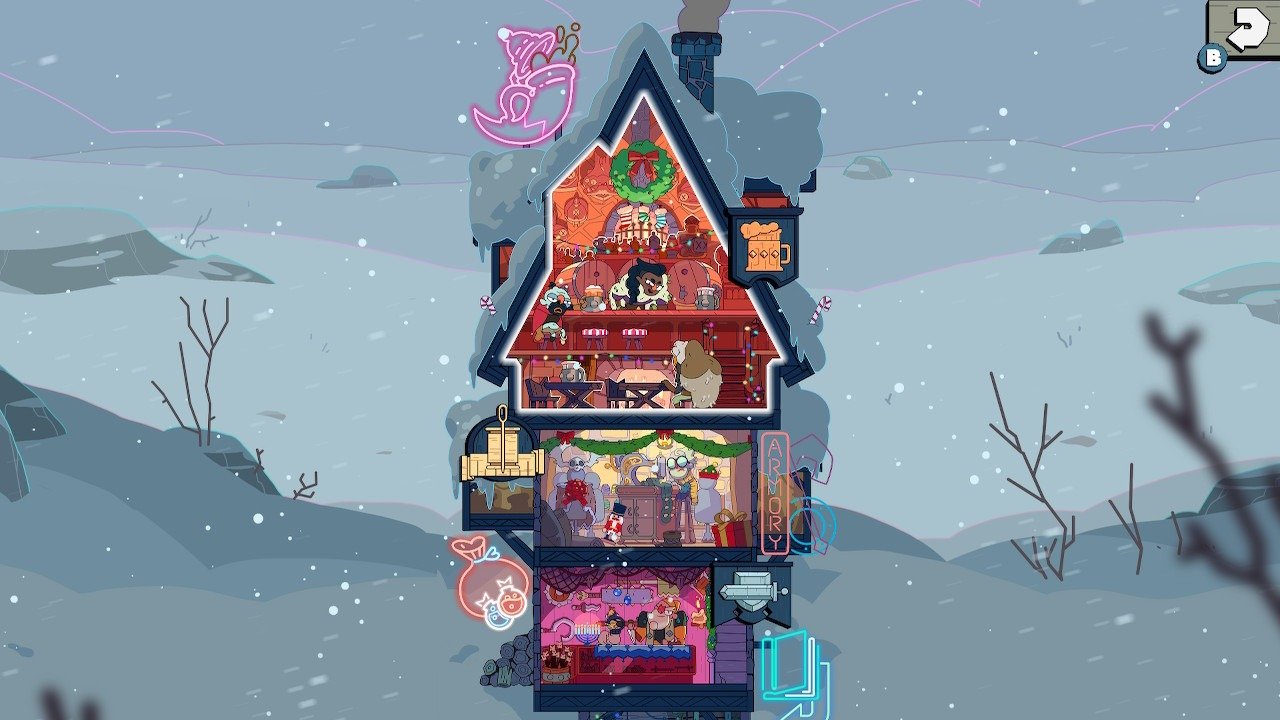 Et le RPG alors ? Et bien pour les amateurs de craft et de loot , une visite au Howling White Wolf, la délicieuse auberge néon-Fantasy, permettra à Jorj de regagner quelques précieux points de vie (certaines bestioles se rebiffent et un mauvais mouvement peut vous faire perdre votre précieux butin), mais surtout de s’équiper d’une nouvelle armure ou de choisir des sorts et armes pouvant être utilisés pour se faciliter la vie dans des niveaux de plus en plus retors, surtout si l’on cherche le high score.