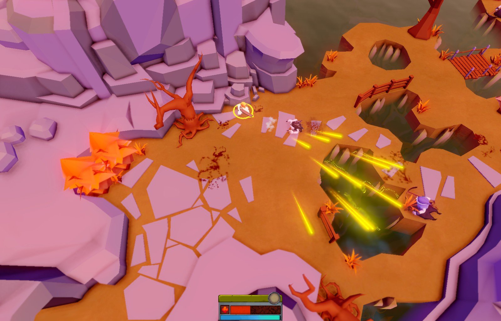 Gunnheim bénéficie d’un style graphique polygonal qui lui donne immédiatement une identité propre . Vous pourrez au total visiter quatre mondes variés (paysage volcanique, monts enneigés…) qui seront tous plus dangereux les uns que les autres de par les ennemis présents mais aussi à cause de pièges disséminés sur les lieux (mines, pics, gouffres…). Tomber dans un gouffre équivaut à une mort immédiate alors reculez face aux ennemis mais pas trop ! Franchissez le vide en dashant et faites attention où vous mettez les pieds.