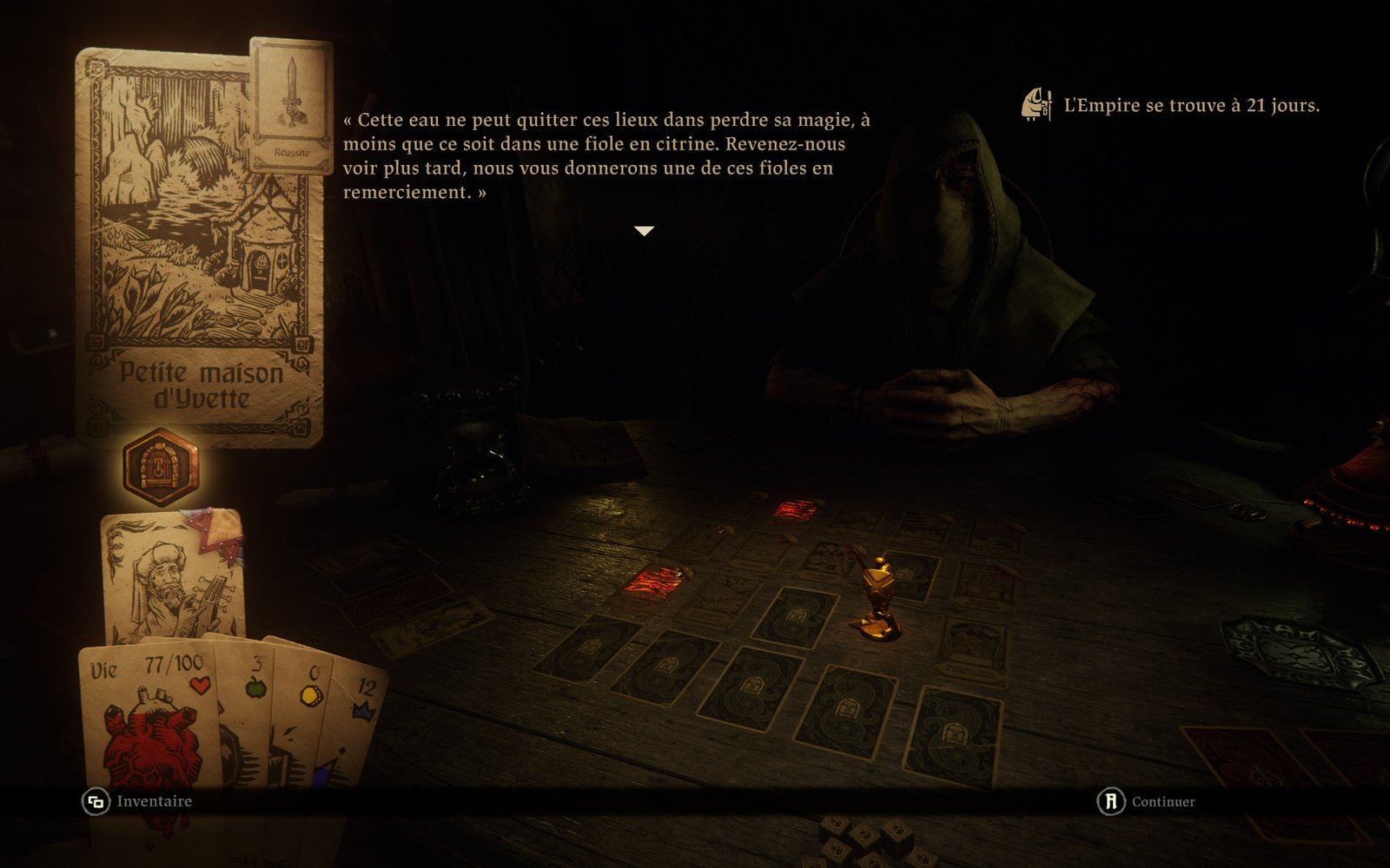 Le principe de gain de cartes a également été gardé. Au début de chaque partie, vous pourrez choisir parmi votre collection un certain nombre de cartes rencontres et armes que vous pourrez ensuite croiser en jeu . Si dans le premier vous vous contentiez bien souvent d’utiliser les plus « fortes », vous devrez ici bien réfléchir aux restrictions de la mission choisie . Certaines vous demanderont par exemple de récupérer beaucoup d’or pour acheter des indices, d’autres se dérouleront en période de disette où les cartes nourritures seront des ressources extrêmement rares, il vaudra alors mieux partir avec des objets ayant de fortes chances de vous nourrir. Un excellent système de filtre est heureusement disponible pour ne pas y passer trop de temps.