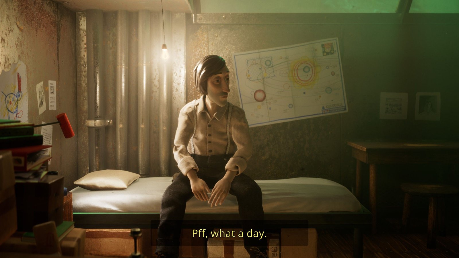 C’est en tout cas vrai pour un bon premier tiers de l’aventure. Une fois que l’intrigue progresse, et que l’on s’est un peu plus attaché aux personnages de la station, la progression devient peu à peu plus intéressante. Cette galerie de personnages, qui semblaient au départ introduits au forceps et caricaturaux, finissent par faire mouche et on se prend au jeu, à s’attacher à eux. Mais cela dépendra principalement de vos préférences. L’écriture de cet Harold Halibut est de qualité, mais elle paraît plus souvent destinée à un public plus jeune, du moins concernant son intrigue principale, ou dans ses twists. Néanmoins, comme ça peut être le cas dans les Disney ou autres Pixar, le jeu regorge de belles réflexions plutôt intéressantes sur la nature humaine, ou encore le renfermement sur soi, qui ont le droit à de beaux dialogues. Harold, tentant fréquemment d’expliquer de belle et touchante manière, les spécificités humaines à son ami, lui aussi perdu, comme un adulte bienveillant le ferait avec un enfant.