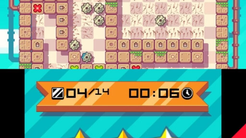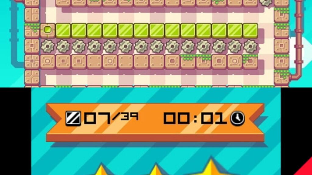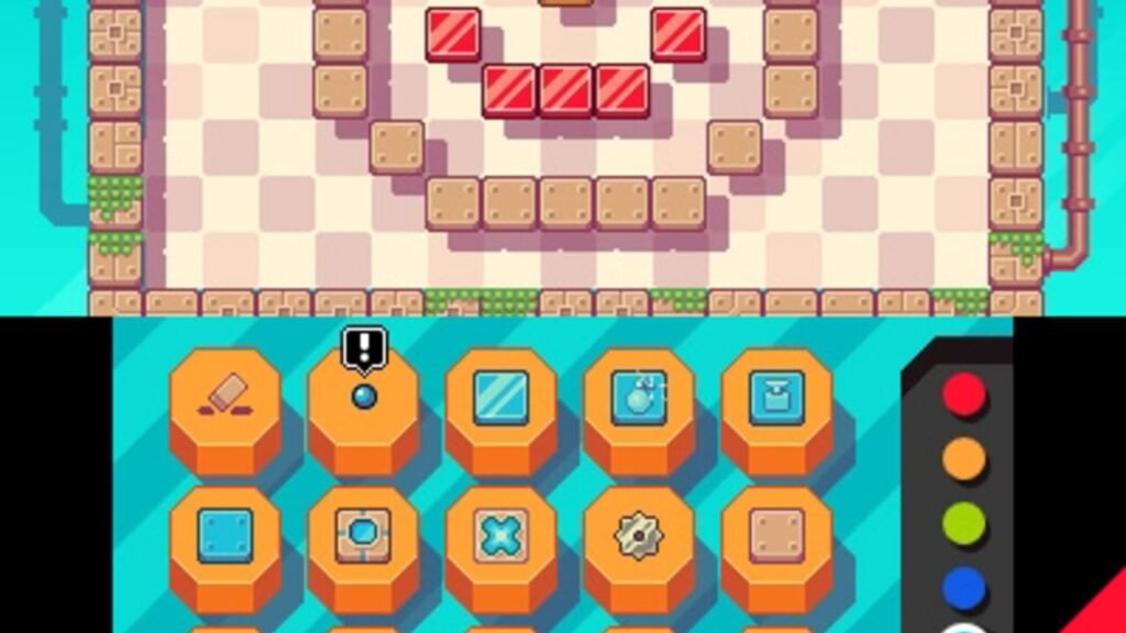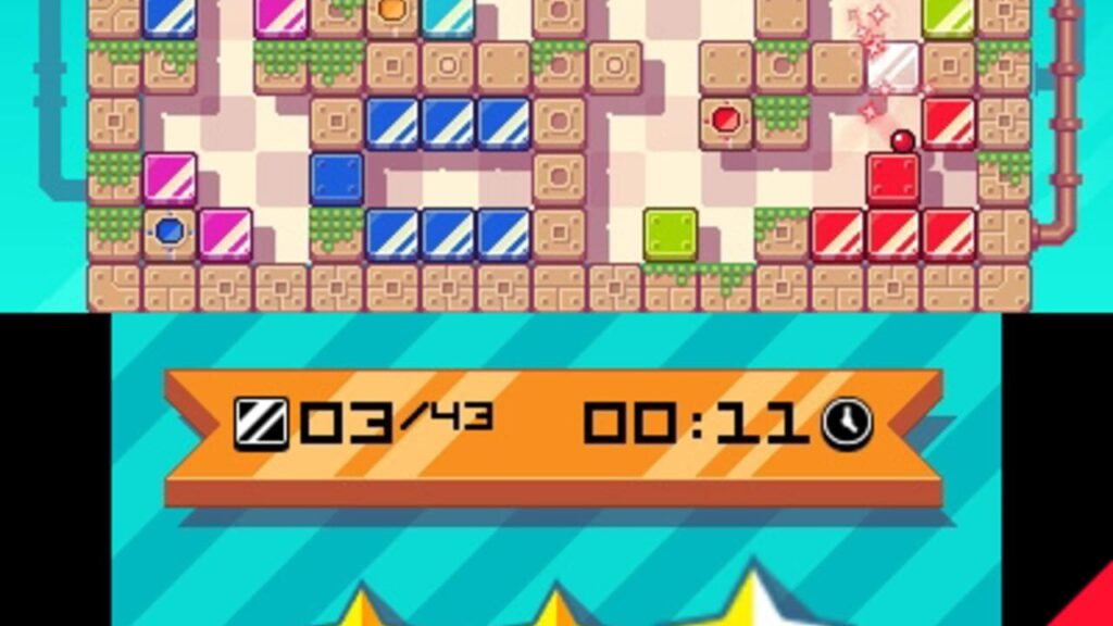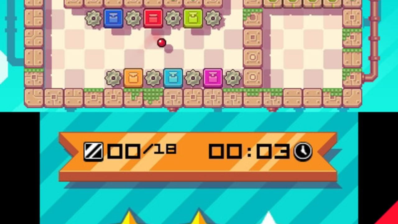 Premier niveau : une balle qui rebondit automatiquement sur les parois… et votre stick, vous permettant de contrôler sa direction. Le but est d’éclater les blocs de la même couleur pour terminer la partie. Viennent ensuite des blocs, toujours de couleur, qu’il faut pousser en ayant la même teinte. Puis apparaissent des interrupteurs vous permettant de changer de couleur, plusieurs blocs de plusieurs couleurs, des détonateurs faisant exploser tous les blocs d’une seule teinte, etc. Rapidement, un ballet de couleurs vives envahit votre 3DS pour vous proposer un puzzle-game aux airs simples, mais qui évolue très efficacement point de vue difficulté. Rapidement, des scies façon Super Meat Boy font leur apparition pour exploser votre balle. Il faudra à tout prix les éviter, en jouant avec une hitboxUne hitbox (littéralement "boîte de collision") est une zone invisible associée à un objet ou un personnage dans un jeu vidéo, qui sert à détecter les collisions ou les impacts. à laquelle il faut s’habituer un petit temps. En effet, la balle semble à un poil de pixel prêt en décalage avec l’environnement, ce qui nécessite d’éviter de « froler » les pièges. Un problème que l’on rencontre avec les scies mais, par exemple, pas du tout avec ces blocs qui se transforment en monstre tentant de vous croquer à intervalles régulières. Bizarre.