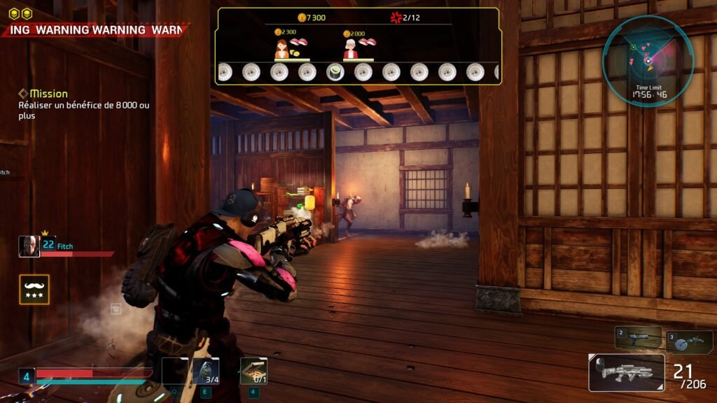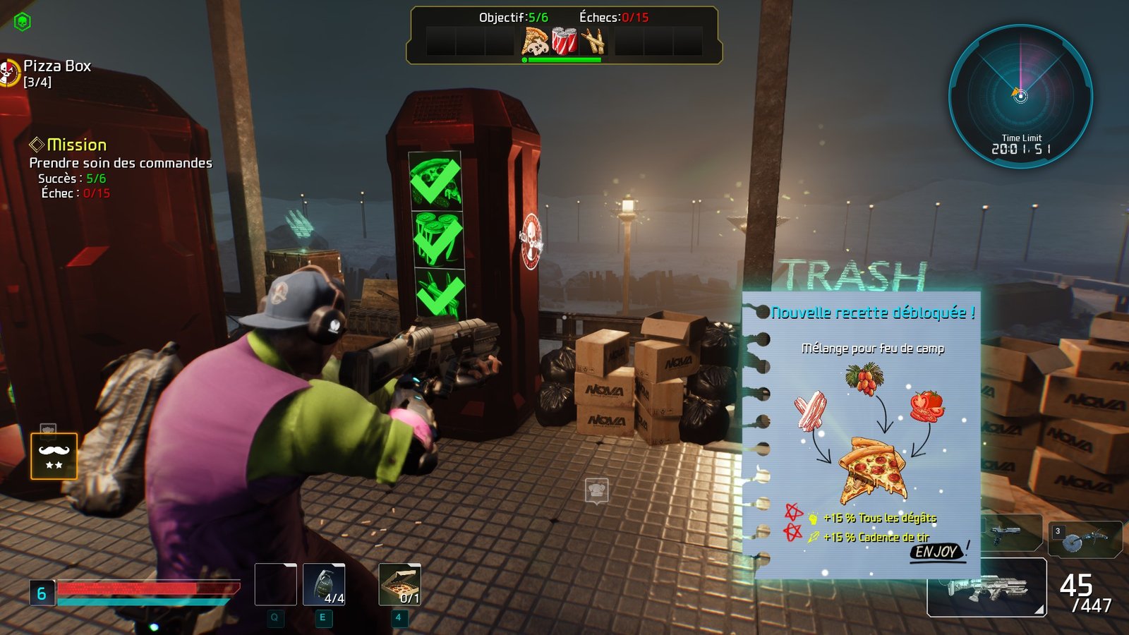 J’ose m’être amusé. J’ose assumer qu’à plusieurs, on peut y trouver de l’intérêt. C’est consternant, c’est bas du front, c’est absolument nul à souhait, mais la progression est tout de même bien présente : vous débloquez des aliments vous permettant de créer des pizzas vous octroyant des bonus différents pour les missions suivantes. Vous pouvez aussi aménager votre QG avec mille et un objets, et cette décoration globale vous débloquera des améliorations supplémentaires. On peut acheter des skins, évidemment tous aussi moches les uns que les autres, ainsi que des upgrades d’armes. Et tout est raté et moche, mais effectif. Mention spéciale pour les mini-jeux d’arcade qui sont d’un niveau de flemme artistique et conceptuelle assez intersidérale (imaginez vraiment “mon premier code en C++” au vu du résultat, et il manque quelques lignes à l’apprentissage).