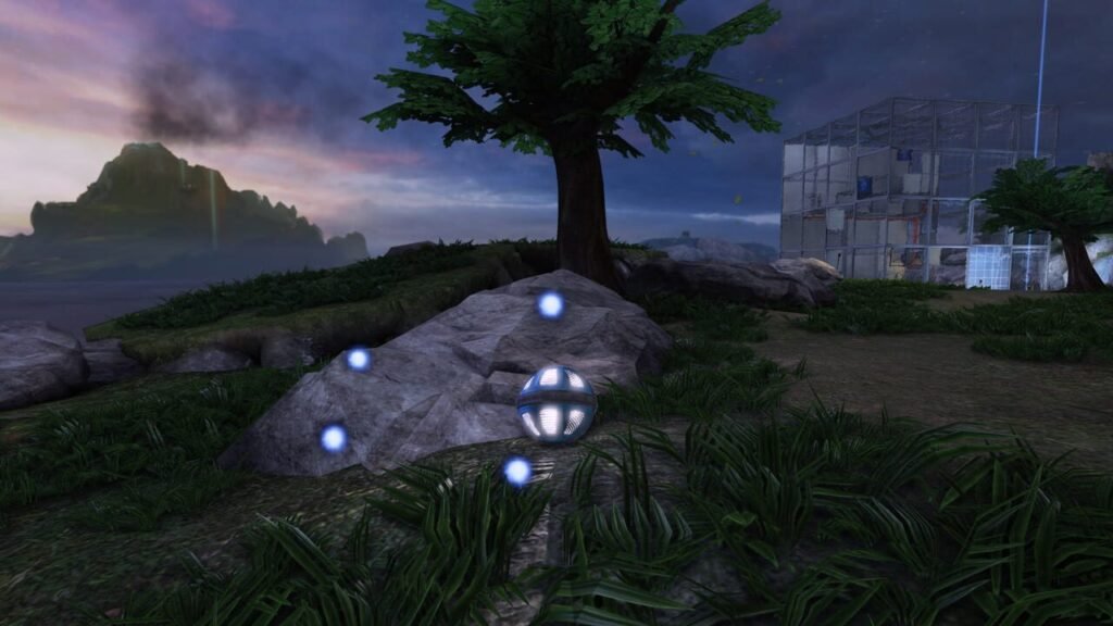 D’ailleurs d’énigmes, il n’y en pas tout le temps. Le jeu se déroule en effet en 2 phases distinctes. Dans la première, on est balancé dans un monde globalement joli mais terriblement banal où on roule sa bille à la recherche de pastilles bleues. Ces pastilles bleues pas vraiment cachées, il faut alors les attirer et les amener devant un poteau qui, une fois alimenté de 3 pastilles, ouvrira la porte du gros cube transparent situé derrière lui qui se révèle être toujours une salle-énigme. Ces salles-énigmes se parcourent toujours avec la même qui peut alors appuyer sur des interrupteurs permettant de tourner le cube et grâce auxquels il faudra amener d’autres boules de couleurs à leurs arrivées respectives. Une fois cela fait, on passera à la phase de recherche suivante.