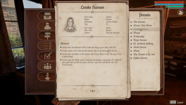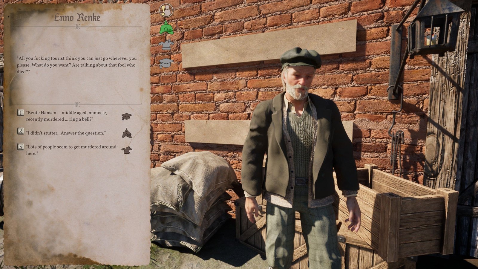 La principale différence avec le jeu précédent reste au niveau de la vue à la première personne, contre une vue TPS dans Inspector Schmidt – A Bavarian Tale . On note aussi une simplification du gameplay superflu, The Ebbing ayant fait le choix de ne pas reprendre certains éléments qui n’étaient pas franchement réussis de son prédécesseur. Exit donc la possibilité de se battre, ce qui n’est pas plus mal, ou les mini-jeux et mini-séquences timées horribles qui n’apportaient pas grand-chose. On se retrouve ici avec un titre bien plus concentré sur ce qu’il c’est faire, l’exploration et l’investigation, et qu’il fait plutôt bien. Il reste tout de même une séquence d’infiltration un peu buguée sur la fin, mais rien de trop rédhibitoire. À noter que si je compare avec le titre précédent, il n’est pas du tout nécessaire d’y avoir joué pour s’attaquer à The Ebbing . Quasiment aucun lien n’y est fait, à part la présence du personnage principal lui-même.