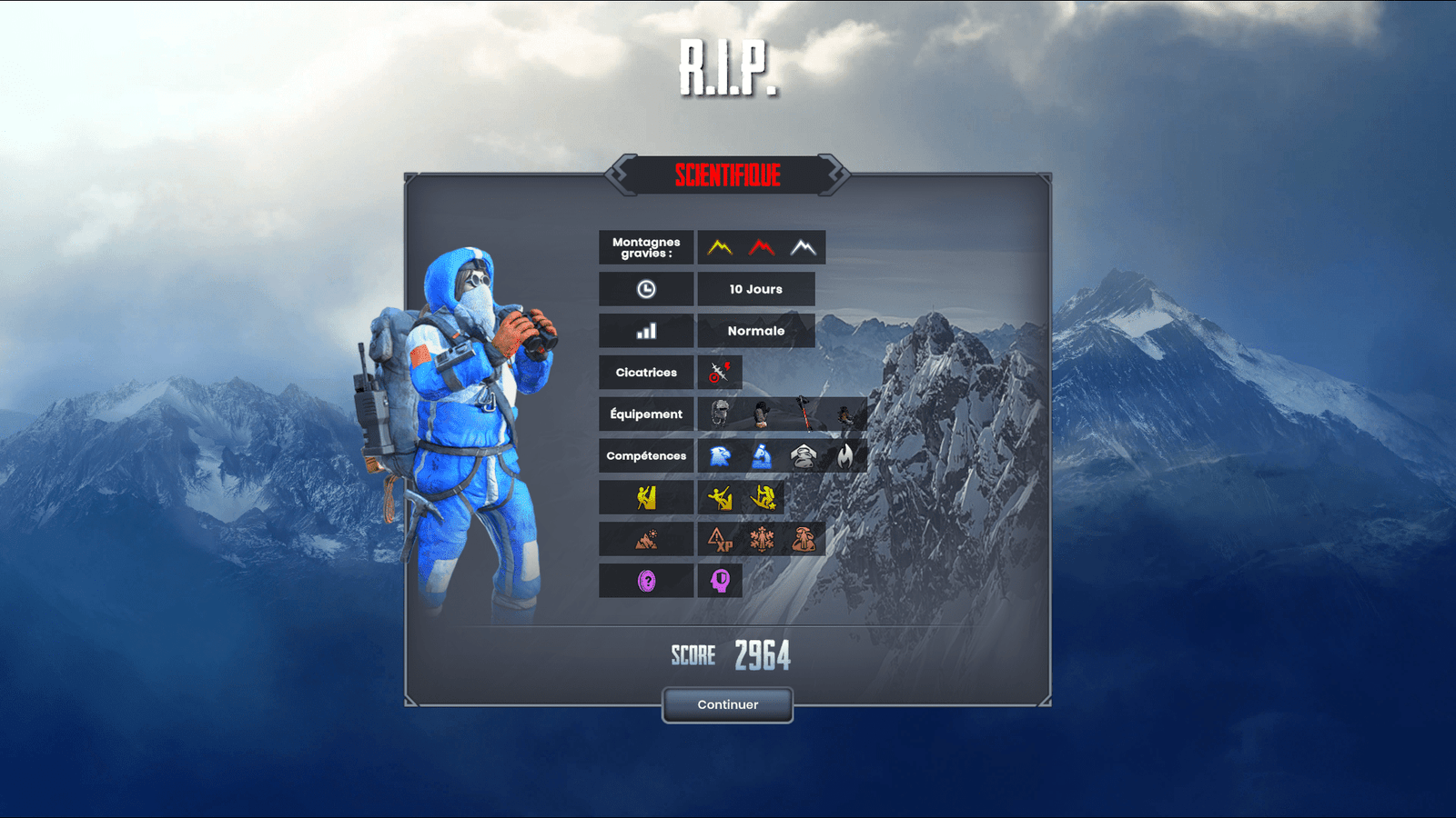 L’escalade se raconte au travers de cartouches textuels présentant différentes situations et proposant plusieurs choix aux effets variés et clairement annoncés au joueur : fouiller un cadavre permet de récupérer du matériel au prix d’une température corporelle et d’une jauge mentale en baisse, et se laisser tomber de fatigue fera certainement remonter votre énergie mais votre santé souffrira d’avoir passé quelques heures à la merci des conditions climatiques hostiles. Quant à la météo, elle oscillera entre le « dégagé » et le terrible blizzard, cumulant températures atroces et visibilité gênant toute anticipation. Ah oui, et il y a un cycle jour/nuit aussi, dont vous devinez aisément les enjeux à cette altitude… Ce n’est qu’au prix d’une surveillance constante des 4 jauges – comme les cavaliers de l’Apocalypse, est-ce un hasard? – de la météo, des réserves de thé chaud et de l’état du sol que vous foulez que la réussite pourra être entrevue. Une petite dimension RPG aide le randonneur vers les sommets, avec un inventaire permettant d’équiper bottes à crampons, mouffles douillettes ou conserves douteuses, et des compétences actives et passives à débloquer grâce à un système d’expérience pour affronter tous les dangers et se construire un profil de « spécialiste de la glace » ou de « champion de la marche nocturne ».