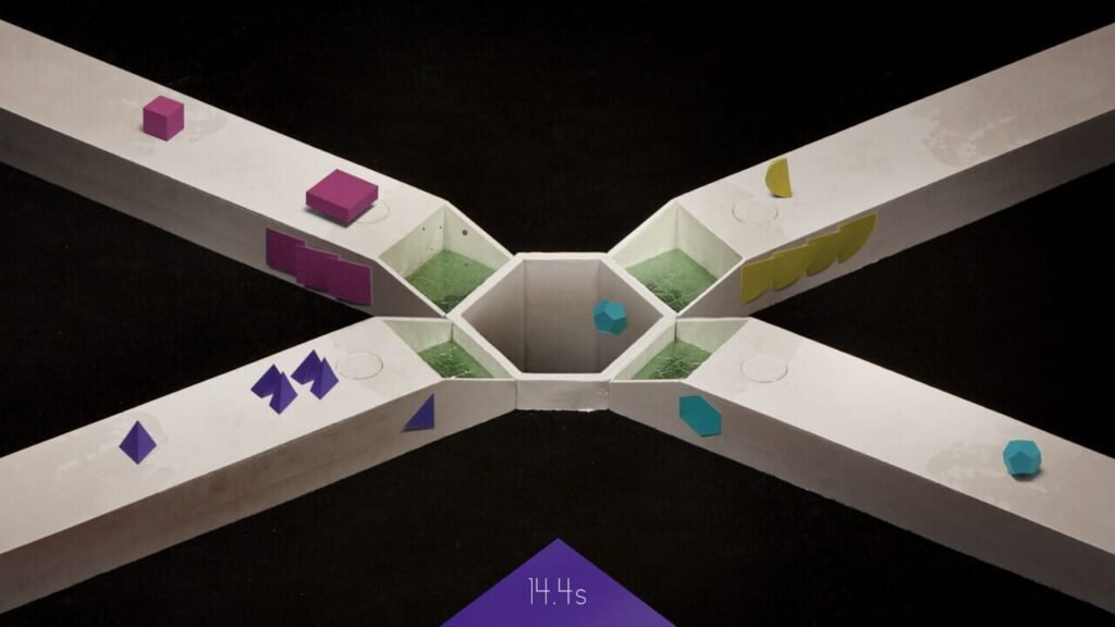 Entièrement modélisés avec leurs petites mains, de quoi découper et mesurer, les formes géométriques et le plateau de jeu de inSynch ont été ensuite photographiés pour un rendu unique. Dans le genre, nous avions déjà testé le point & click Lume il y a quelques années maintenant et ce inSynch partage le même amour de la création manuelle. Après, cela reste un jeu totalement différent basé principalement sur la musique. Pas du tout en rythme, loin de là, inSynch met en place quatre « chemins » de quatre formes géométriques aux couleurs tout aussi différentes. Ces quatre formes avanceront donc en stop-motion jusqu’au centre du plateau, constitué d’un trou béant et entouré d’eau. Le but est d’activer un tremplin en fin de course pour lancer la forme géométrique dans le trou, sans se louper et tomber dans l’eau. Si vous réussissez, vous gagnez quelques points. Le but étant, évidemment, d’en réaliser un maximum. Là ou la musique entre en jeu, c’est quand chaque validation d’une forme enclenche un son d’instrument, une petite mélodie, quelques notes. Mises bout à bout, votre expérience de jeu somme toutes très quelconques se transformera alors en concert très personnalisé. Plutôt perturbant au début, ce principe donne au jeu toute sa saveur artistique. Dommage que point de vue ludique, ce ne soit pas aussi intéressant.