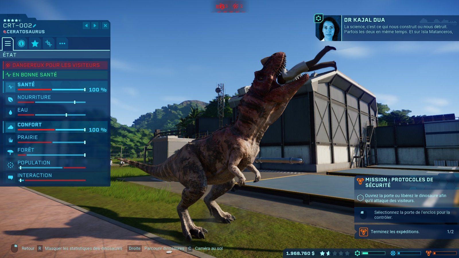 Tout commence avec un tutorial, comme tout bon jeu de gestion qui se respecte, lui et ses joueurs. Une voix-off correctement implémentée dans l’histoire de la franchise Jurassic Park vous accueille et vous demande d’effectuer quelques missions : comprendre comment installer librement les constructions, savoir relier le tout par des pylônes électriques alimentés par de grosses centrales au préalable bien placées sur la carte puis la mise en place d’enclos. Globalement, à deux trois sandwicheries et stations météo prêt, on a là un bon début pour comprendre le principe des constructions en dur du jeu. La création est agréable : on peut bouger les bâtiments dans tous les sens pour les positionner au mieux et la terraformation est de qualité. Que vous voulez plus ou moins d’arbres, davantage ou non de zones d’eau, le jeu vous fournira cela de la plus efficace des façons avec un outil de qualité.