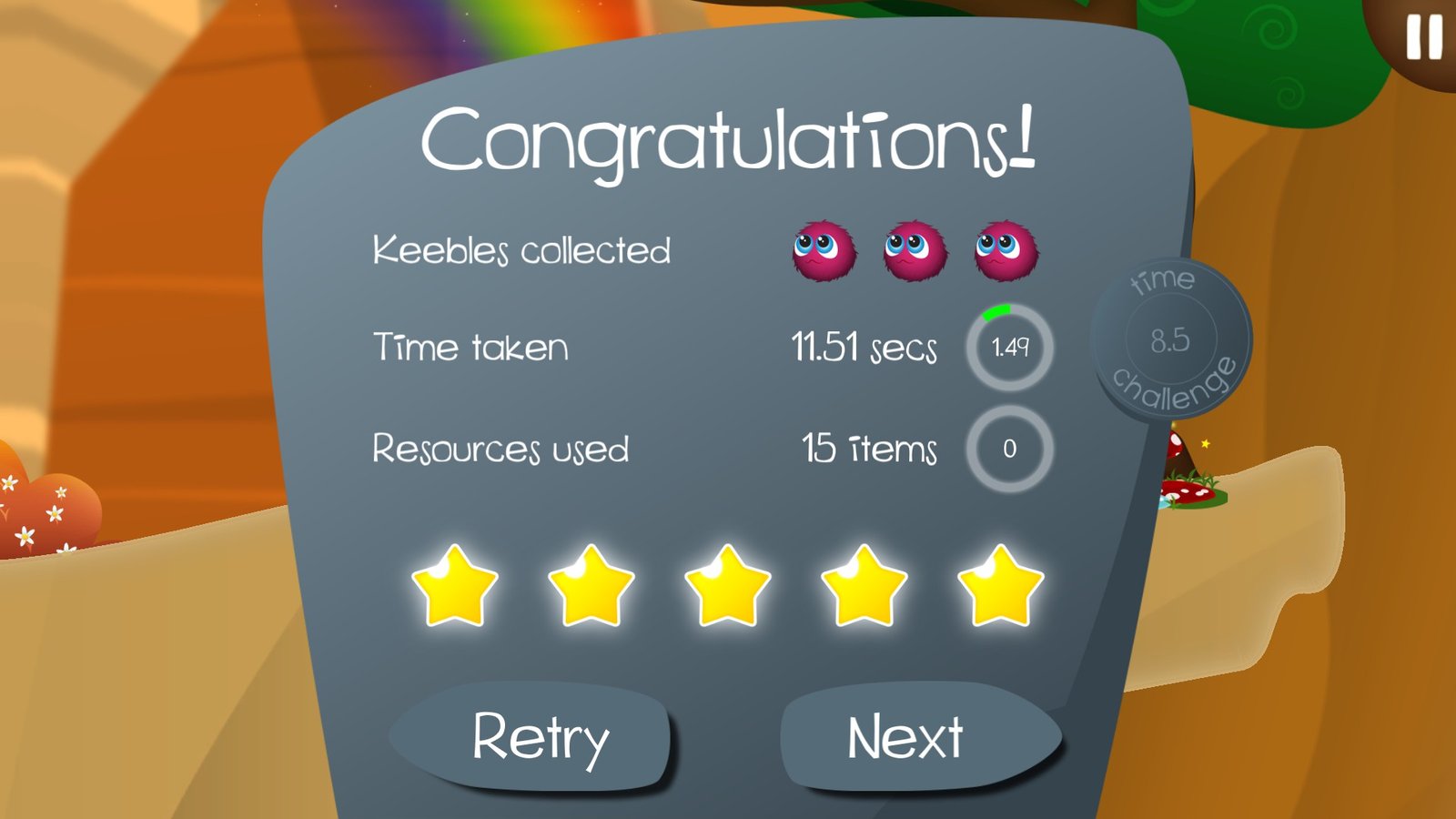 Une fois lancés sur le parcours vous aurez à relever différents défis : sauver les trois Keebles disséminés sur le niveau, atteindre la fin avant que le temps imparti ne soit écoulé et aussi n’avoir utilisé que le nombre de matériaux de construction qui vous était fixé. Ce n’est qu’à ce moment là que vous remporterez les 5 étoiles. Il va sans dire que ce ne sera pas toujours une mince affaire, certains Keebles étant placés en hauteur ou dans des crevasses et les obstacles ne manquant pas. Chacun peut trouver son compte dans cette difficulté car il est possible de passer le niveau rien qu’en atteignant la fin , le seul prérequis étant de ne pas briser la boule. On peut jouer pour faire un 100% ou alors se concentrer sur les records de vitesse par exemple.