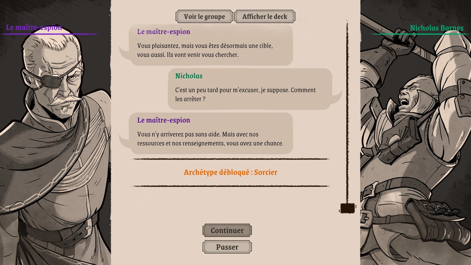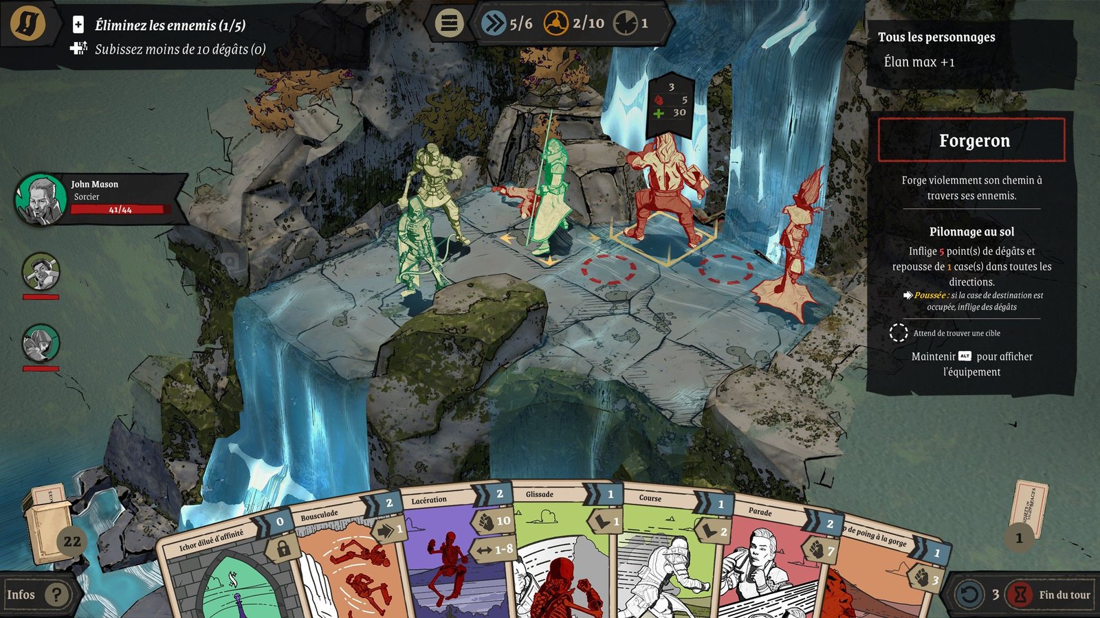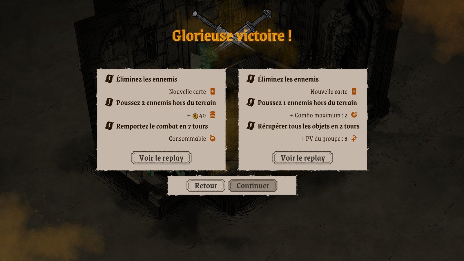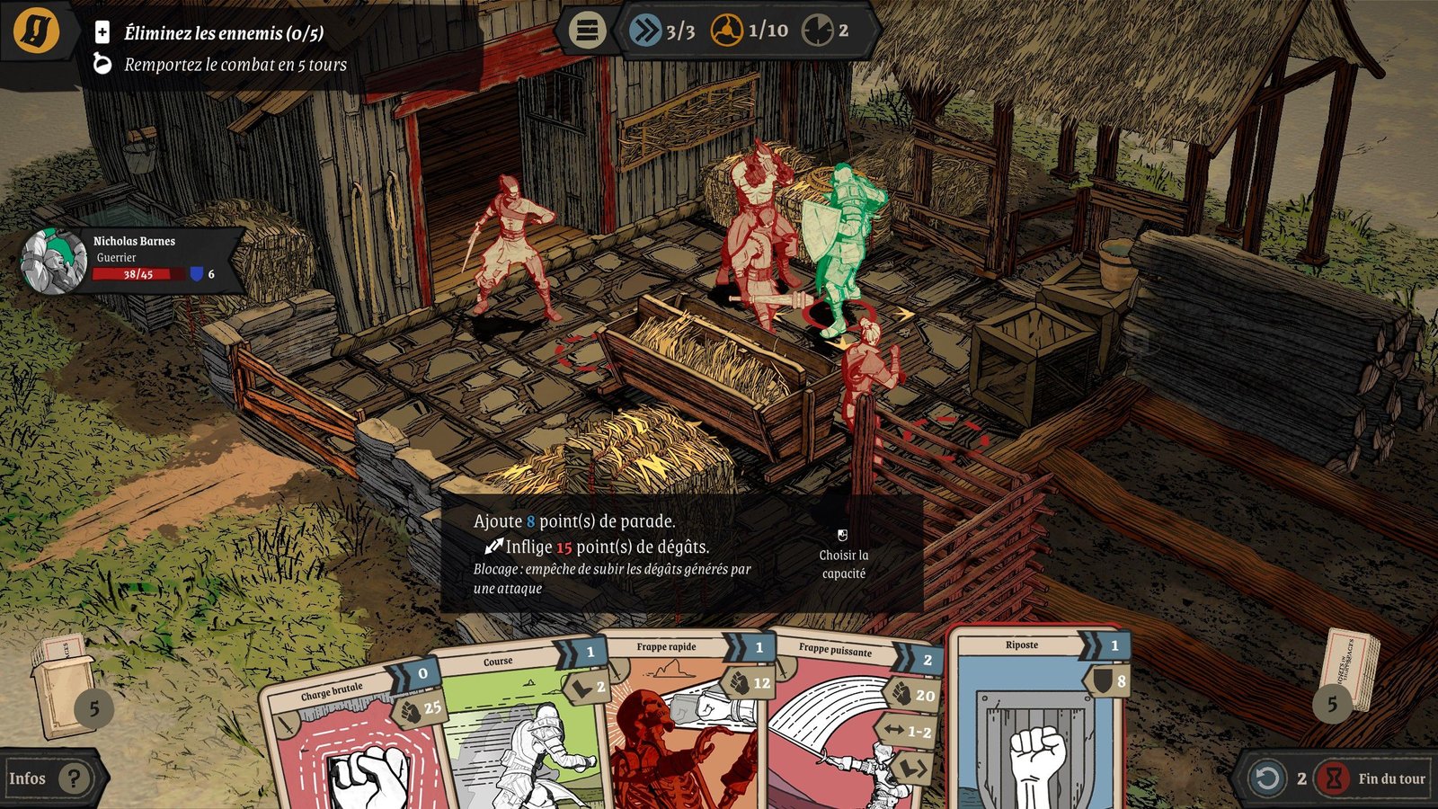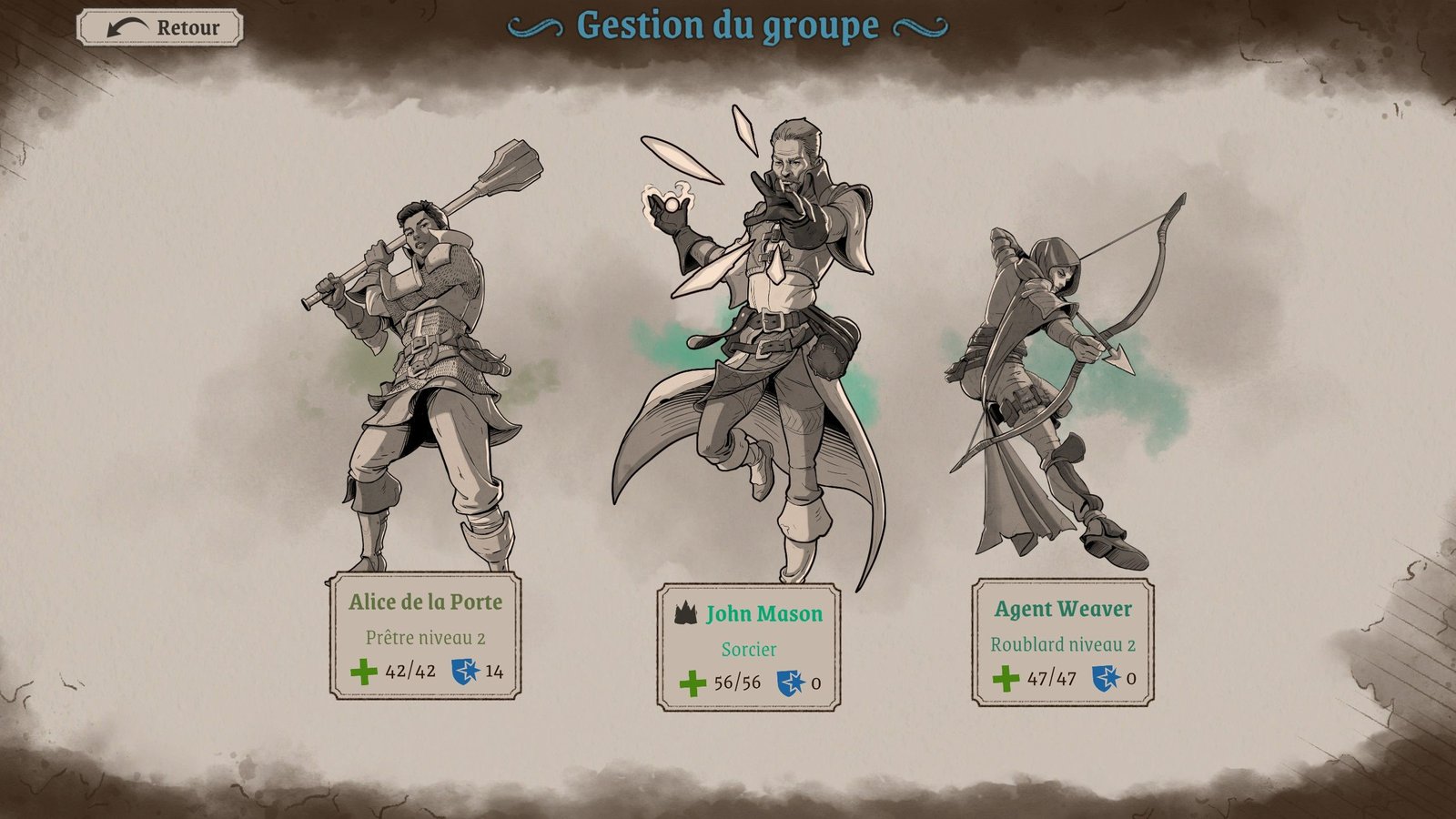 Votre serviteur n’est pas un grand adepte de jeux de carte, le deck building ce n’est vraiment pas trop mon truc, et globalement, je déteste le hasard. Mais s’il y a bien un truc que j’aime, c’est balancer les gens par les fenêtres, par-dessus des rambardes ou dans des ravins (dans le jeu vidéo, évidemment, pas en vrai, mévouzètfou ?). This is Sparta ! Donc quand un jeu propose la possibilité de filer des grands coups de latte dans le postérieur de vilains pour les éjecter vers une mort certaine, je suis toujours partant. On commence le jeu en choisissant un des héros débloqués, un des modes de difficulté, et c’est parti ! Chaque héros (Guerrier, prêtre, voleur, magicien, etc.) va avoir un set de cartes pour entamer l’aventure. Mais ce deck va s’étoffer au fur et à mesure des victoires remportées, des objectifs atteints et des achats possiblement effectués dans les boutiques sur le terrain de jeu. On peut aussi y acheter de l’équipement, ou en trouver, l’améliorer, et bien sûr recruter jusqu’à 2 bonhommes supplémentaires, cela ajoute des choix tactiques très intéressants (combos de soutien, styles de combats différents, etc.). Ah oui, au départ et jusqu’à avoir perdu, le panel de cartes va être assez limité. Il faudra soit arriver au bout de l’aventure (bonne chance avec les cartes un peu nulles du début) soit perdre pour pouvoir monter en niveau et débloquer de nouvelles cartes, à la manière d’un rogue quoi (il y a plus de 300 cartes au total). Une fois le panel de possibilités un peu étendu, la réflexion sera non pas de remporter l’affrontement, mais de le faire de la façon la plus optimisée possible, sachant que les « retours arrière » sont limités, voire bloqués suivant le mode de difficulté.