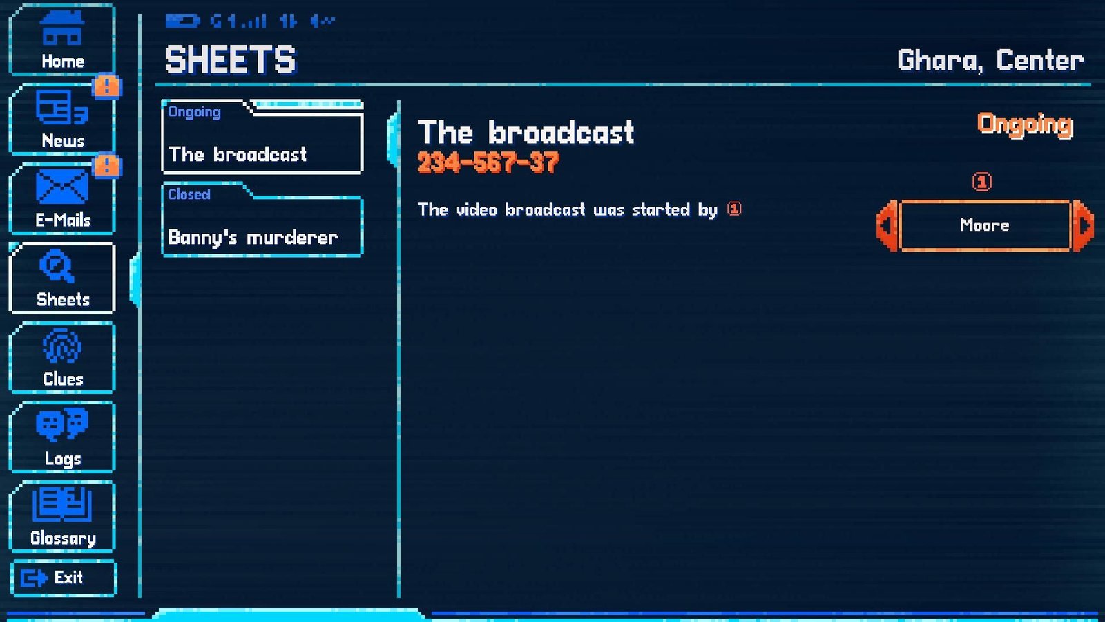 C’est d’ailleurs un des points forts de cette aventure narrative. Bien que l’on ait un univers très détaillé, le jeu a la bonne idée de se concentrer sur son histoire et son enquête, où les informations sont distillées au compte-gouttes. Ici pas de quête secondaire ou d’histoire facultative. Il en résulte un jeu certes assez court (comptez environ 5 heures pour atteindre une fin), mais avec un rythme soutenu tout du long de l’aventure, qui nous pousse toujours vers l’avant. D’autant que contrairement à un titre de prime abord similaire tel que Tales of the Neon Sea , Lacuna ne propose pas d’énigmes à base d’objets ou encore de puzzles ou autres casse-têtes, mais base son gameplayOu « jouabilité » en français, fait référence à la façon dont le joueur interagit avec un jeu vidéo. quasi exclusivement sur la récupération et l’association d’indices afin d’en déduire des conclusions faisant avancer l’enquête. Les indices sont glanés via emails, articles de journaux, mais surtout via l’interrogation de témoins et de suspects, en veillant bien sûr à soigneusement choisir ses questions et réponses. Le jeu se targue d’ailleurs d’avoir un système de dialogue non linéaire où il faut faire des choix et où il ne serait pas possible d’épuiser toutes les possibilités de dialogue. Dans les faits, c’est surtout vrai pour quelques dialogues clés et les choix restent assez limités. Néanmoins, ils semblent avoir une incidence sur la suite des événements, et sur la fin obtenue. Il est en effet possible de voir différentes fins selon nos actions choisies tout au long de l’aventure. Attention tout de même, il ne s’agit pas de très gros changement qui vous donneront envie de refaire le jeu plusieurs fois de suite (d’autant qu’il n’est pas possible de recharger une sauvegarde et qu’il faut donc tout reprendre du début). Le destin de plusieurs personnages est cependant affecté par vos choix et on apprécie l’effort fourni par les développeurs pour nous donner une fin un peu plus personnalisée.