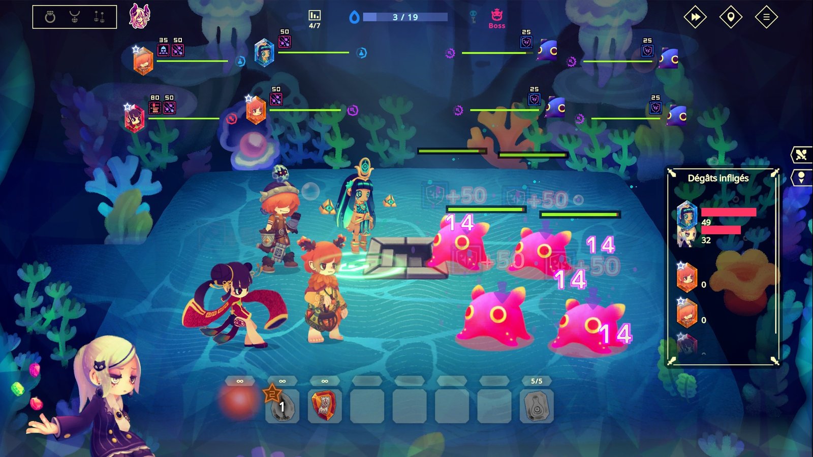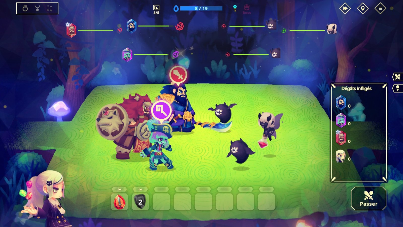 S’il est bien question de voir évoluer votre personnage dans ces différentes salles et étages, reste que vous ne combattrez pas directement. Pour ça, vous aurez des héros : enfin, un seul au hasard au démarrage du donjon, puis d’autres à débloquer au fil de votre exploration. L’argent gagné au fil des combats permet de débloquer d’autres slots de héros (jusqu’à six) et même d’en acheter des identiques en magasin pour en combiner trois (ce qui les transformera en version supérieure). Les héros peuvent avoir des synergies de pouvoirs passifs, des liens de pouvoirs actifs, et ne seront donc pas à choisir à la légère si on veut la jouer fine stratège.