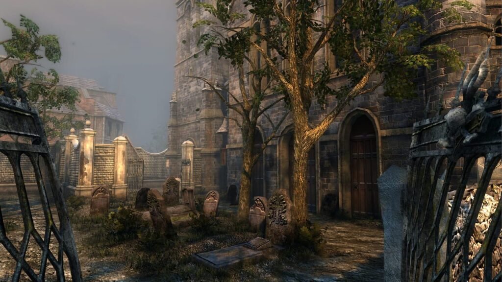 C’est ce que vous proposent de mettre au clair les développeurs de chez Frogwares, attachés au détective anglais depuis bien longtemps maintenant… Trois caméras sont proposées pour, entre autres, offrir des contrôles agréables aux versions « consoles » du jeu : pour commencer, un aspect poin’t & click avec un personnage qui bouge au moindre de vos clics. On découvre ensuite le mode « troisième personne » permettant de contrôler le détective, Watson voir un troisième personnage mystère qui a du chien, comme dans un jeu moderne. Enfin, la vue « FPS », très pratique et immersive, mélange habilement la découverte de décors, la fouille facile et l’aspect « jeu d’aventure à l’ancienne » sans les écrans fixes obligatoires. Il est possible de passer de l’une à l’autre des vues, d’un clic ou d’une pression sur la bonne touche. Très pratiques, surtout pour les divers moments de fouille des environnements, ces caméras permettent surtout à chaque joueur de s’y retrouver au mieux. Ce qui fait extrêmement plaisir dès le lancement du jeu, c’est le nouveau moteur visuel (nouveau face à celui utilisé dans les précédentes aventures du même développeur) . Il y a encore énormément de travail à faire, surtout au niveau des animations : Sherlock fait apparaître et disparaître des objets dans ses mains comme bon lui semble, certaines animations sont vraiment très vilaines et manquent totalement de logique visuelle, par contre pour ce qui est du moteur graphique on a de quoi être surpris. Les environnements extérieurs, surtout, sont assez sublimes.