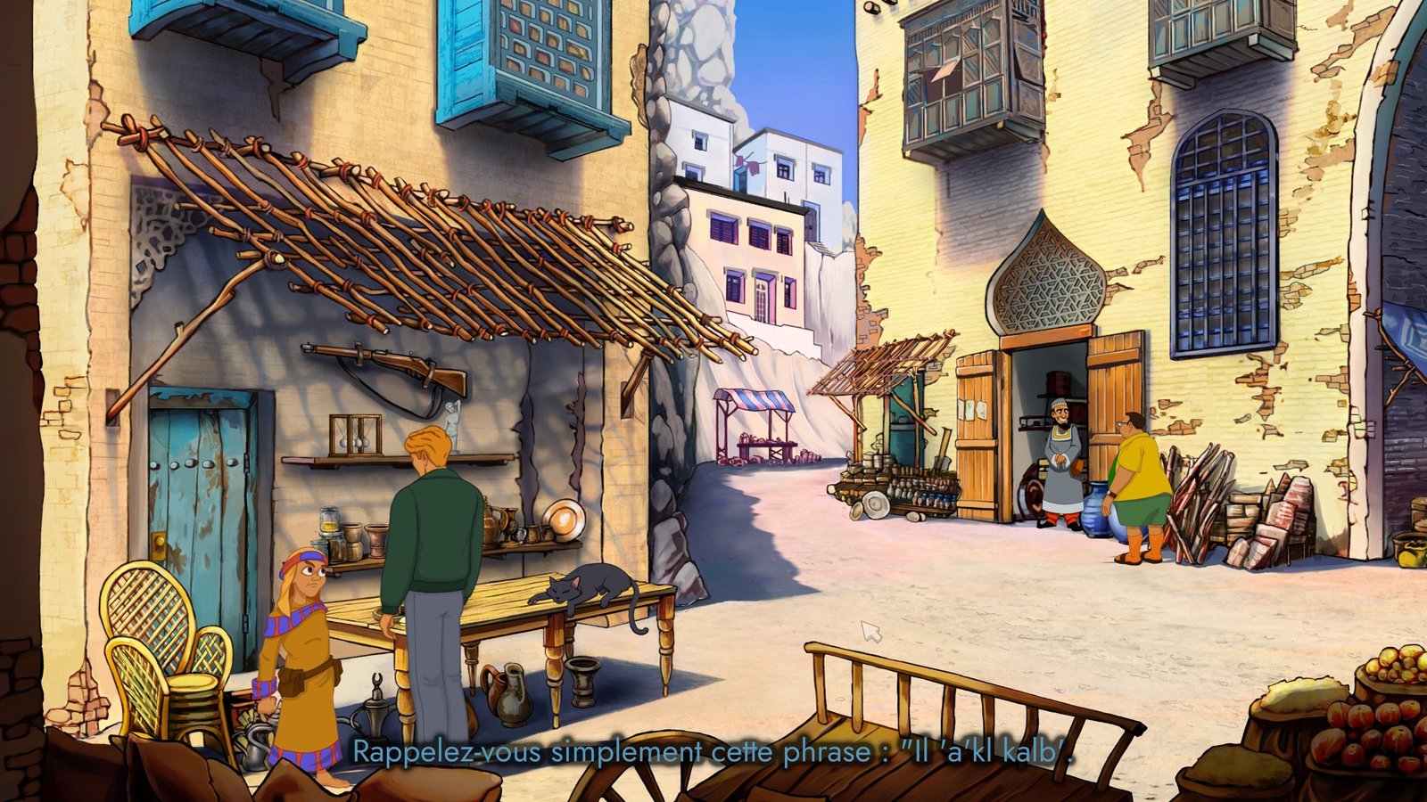 Le doublage d’origine est toujours présent et malheureusement, il a pris un peu d’âge (tant en anglais qu’en français). On sent que, malgré les différents traitements apportés, les voix grésillent un peu parfois et on constate des sautes de volume assez gênantes, mais c’est bien plus atténué que dans la version Director’s Cut. On retrouvera donc avec plaisir Emmanuel Curtil et son meilleur accent, Nathaniele Esther, le regretté Pierre Hatet, et Philippe Peythieu, entre autres, dans différents rôles. Il aurait été difficile de refaire ces voix, de toute façon, et on peut comprendre que les enregistrements d’époque aient pris de l’âge (surtout qu’ils n’avaint pas vocation à être conservés, pour une réutilisation ultérieure). Dans un jeu où on papote tout le temps, c’est un peu difficile à supporter parfois, et c’est bien dommage. Cela gâche-t-il le jeu ? Pas forcément, une fois qu’on est dans l’ambiance, on s’y fait, mais peut-être qu’un nouveau joueur n’y trouvera pas son compte. Cependant, les développeurs sont à l’œuvre et les différentes mises à jour depuis la sortie du jeu ont bien atténué ce défaut. Les énigmes, elles sont les mêmes qu’à l’origine, et bien que la chasse au pixel ne soit plus vraiment de mise, il reste par moment difficile de comprendre ce que le jeu attend du joueur. Il faut bien penser à regarder tous les objets interactifs, parler à tous les gens (et les regarder aussi) et épuiser tous les sujets de conversations, et ne pas oublier de revenir reparler un peu plus tard, sait-on jamais. Il est impossible de rester bloqué (on peut mourir, mais le jeu nous prévient en général quand une action risquée va survenir) et la sauvegarde automatique est plutôt généreuse. En dernier recours, une aide dans le menu peut guider le joueur bloqué ou impatient à venir à bout de la conspiration des templiers.