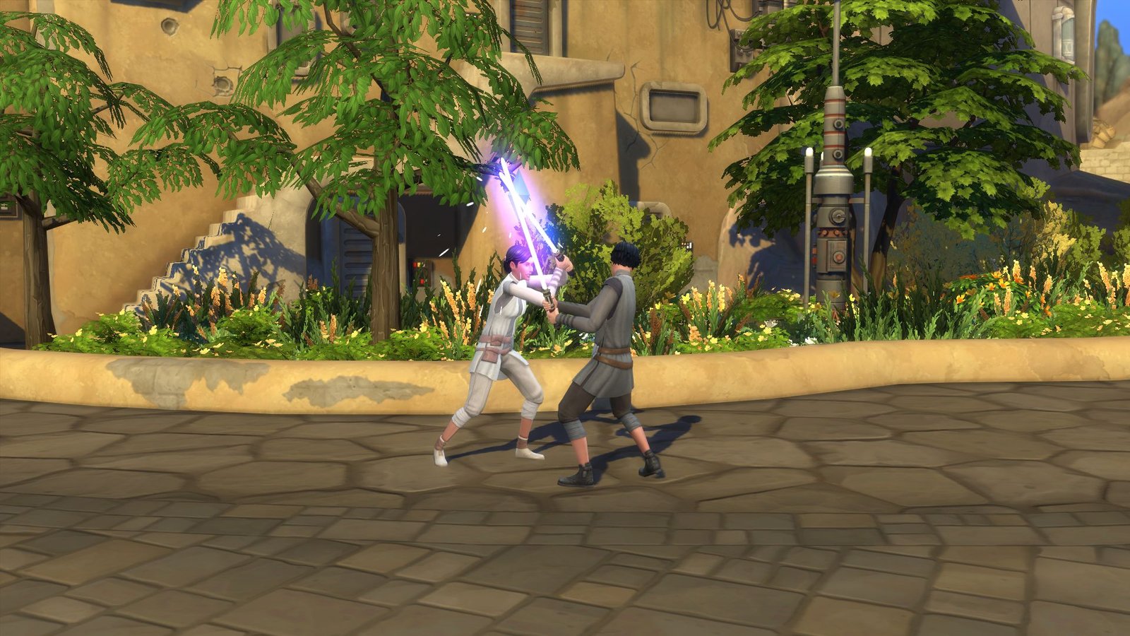 Beaucoup d’objets sont à découvrir sur Batuu. Du simple objet de piratage, au sabre laser, en passant par les faux papiers, nombreux sont ceux qui serviront à faciliter les quêtes. Il est aussi possible d’acquérir un droïde en cherchant les bons objets éparpillés sur Batuu ou de se construire son propre sabre et d’engager des duels avec d’autres Sims. Des personnages connus de la saga sont présents dans ce pack. Ce qui est plutôt appréciable, même si les interactions avec eux se révèlent plutôt limitées.