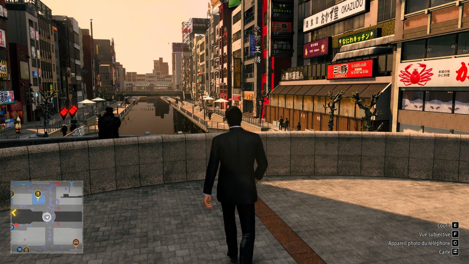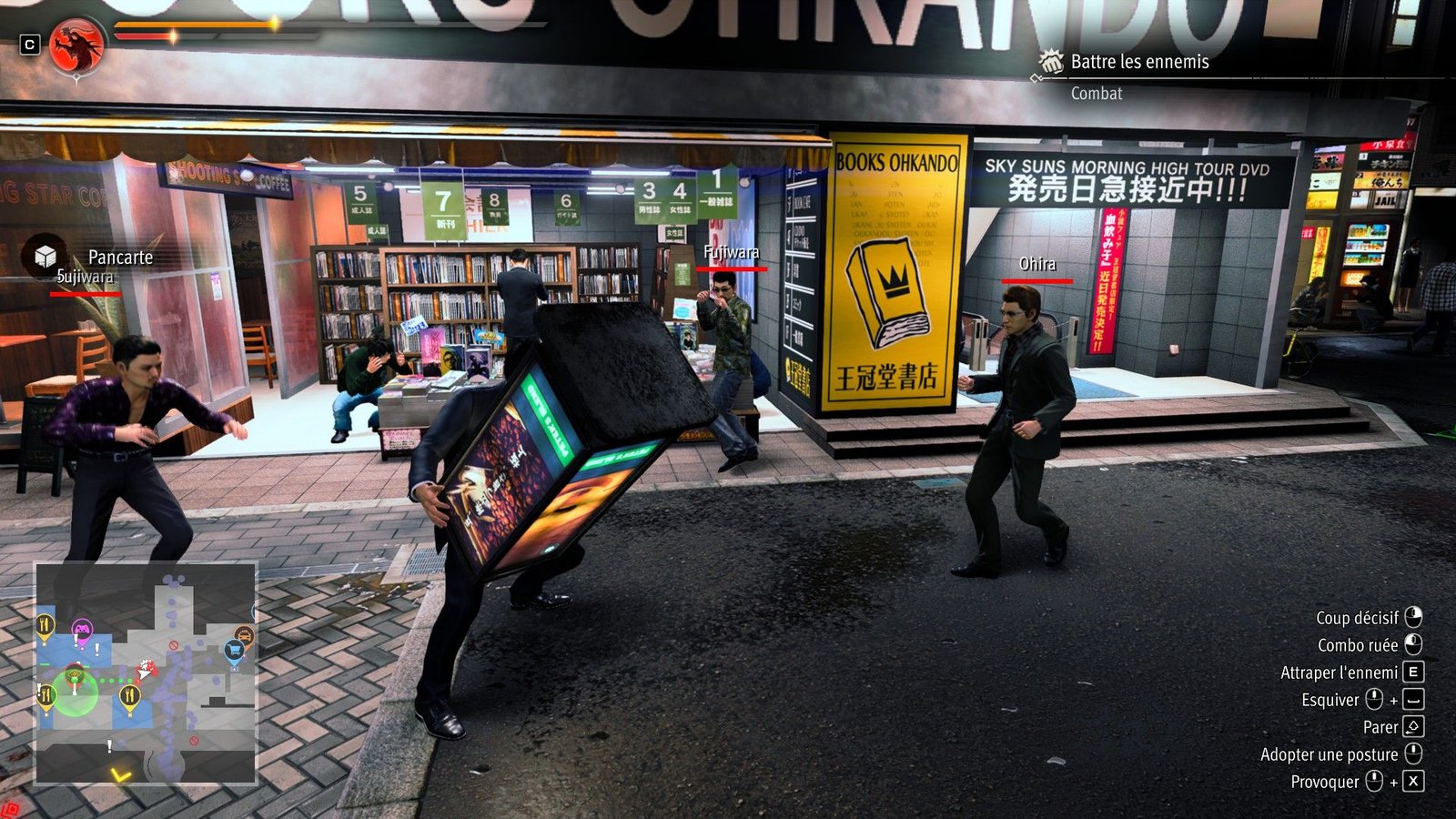Utiliser les objets de l’environnement (chaises, pancartes publicitaires, vélos, scooters, extincteurs…) comme armes improvisées est toujours aussi plaisant, mais on peut aussi se saisir des véritables armes lâchées par les ennemis (couteaux, battes de baseball, matraques électriques…) pour les retourner contre eux. Il faut aussi savoir contrer avec le bon timing les assauts des adversaires, surtout leurs attaques ultimes, pour leur faire encore plus de dégâts. Améliorer ses statistiques grâce à son équipement aide à gagner encore plus de puissance et à être plus résistant (saignement, feu, étourdissement, électricité), tout comme améliorer ses aptitudes grâce aux manuels d’arts martiaux que l’on peut obtenir en récompense, acheter, ou simplement trouver en fouillant les lieux que l’on traverse. L’exploration est bien entendu encouragée avec, notamment, des valises qui trainent un peu partout et contenant des éléments de buff à l’intérieur, ainsi que 50 clés de consigne de Sotenbori à trouver pour accéder au contenu des casiers. Il peut d’ailleurs être nécessaire d’utiliser le câble de la montre pour attraper certains objets inaccessibles sinon. Les cartes sont en revanche peu nombreuses et de taille assez réduite avec les traditionnels murs invisibles qui empêchent d’aller au-delà des limites imposées. Mais il y a aussi quelques intérieurs à visiter.