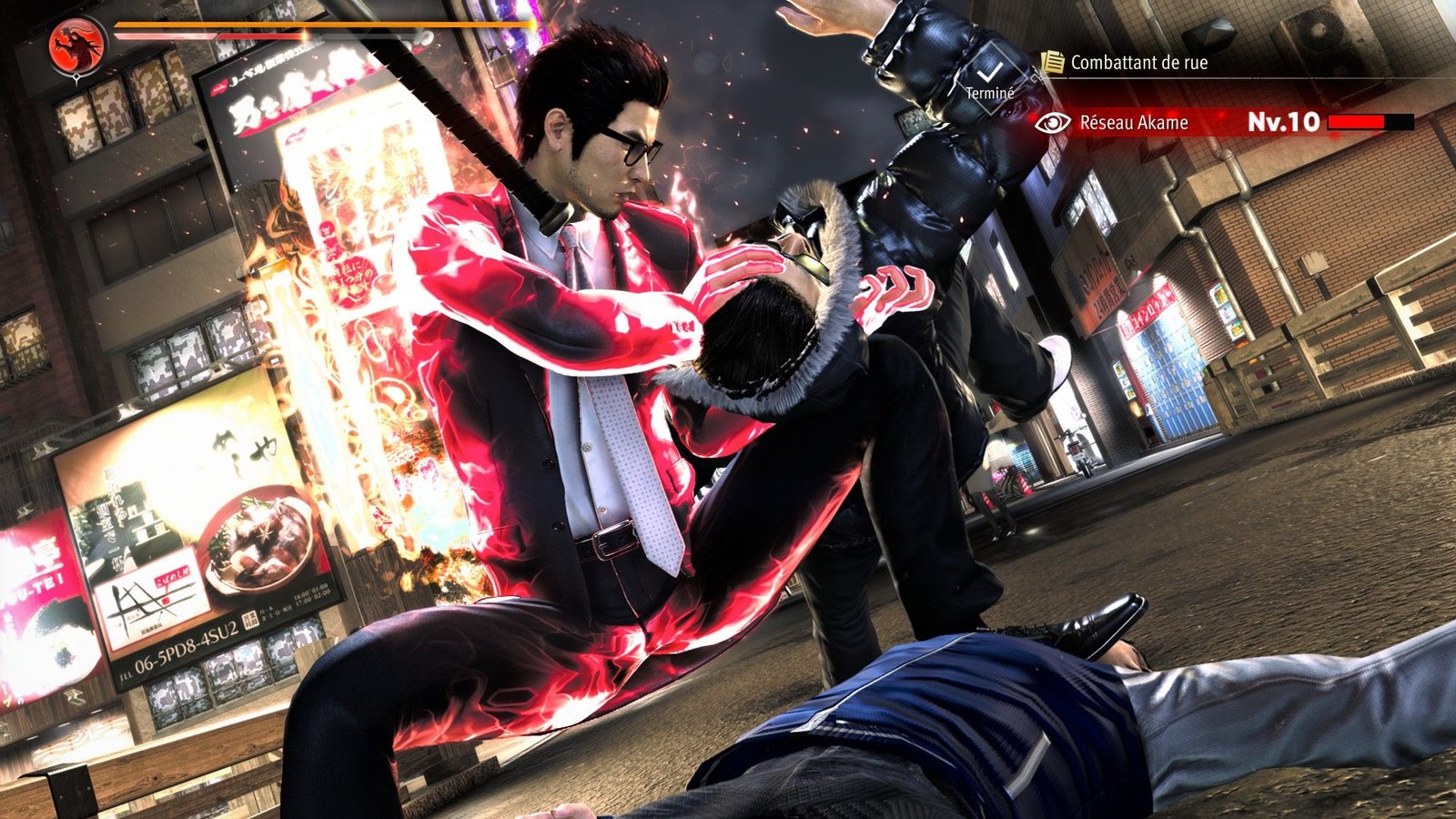 La participation au réseau d’information d’Akame, une jeune fille que l’on rencontre et qui cherche à aider son prochain, apporte notamment des quêtes annexes pour étoffer le jeu. Vous serez ainsi amené à donner un coup de main à certains individus en calmant les ardeurs des voyous qui les harcèlent, en allant chercher ceci ou cela pour eux (en l’achetant ou en l’attrapant avec votre câble), ou encore en prenant en photo certains lieux avec votre smartphone. Rien de bien folichon et surtout beaucoup de répétitivité là aussi. Mais des jobs vous sont également proposés, ainsi que des missions qui payent bien, avec leurs propres scénarios annexes. Tout comme l’histoire principale qui n’est pas fofolle, ceux-ci peuvent s’avérer vraiment très accessoires, mais jouent la touche de l’humour et parviennent parfois à faire mouche. En récompense, la boutique Akame vous est ouverte et les points Akame servent à améliorer vos aptitudes. En dehors de cela, vous pouvez manger dans les restaurants ou en faisant vos courses dans les supérettes pour restaurer votre santé ou obtenir un buff, ou aller picoler jusqu’à vous enivrer, ce qui débouche sur un déplacement erratique, mais permet de remplir plus rapidement sa jauge de ferveur.