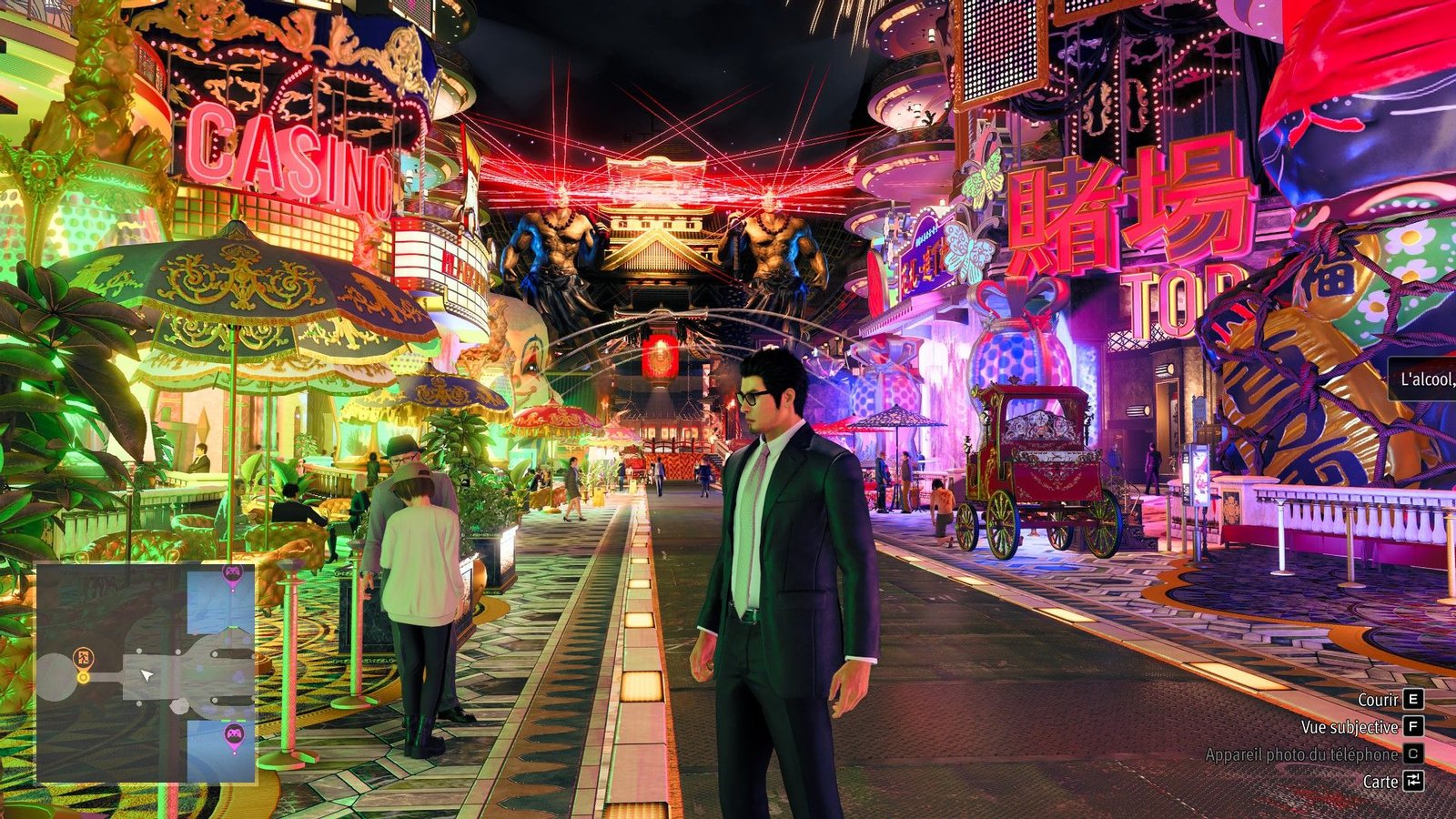 Pour les combats, nous sommes également en terrain connu, avec 3 niveaux de difficulté offerts. Kiryu distribue allègrement coups de poing et de pied en temps réel, renouant ainsi avec les origines de la série. Il peut, dans certaines situations, entrer en furie, et même enclencher une attaque dévastatrice lorsque sa jauge de ferveur est suffisamment remplie, voire extrême lorsqu’elle est pleine. En style de combat agent, il dispose de gadgets tels que le câble de sa montre qui lui permet d’attraper ses ennemis et de les projeter, des drones qu’il peut utiliser pour attaquer ou distraire ses adversaires, une cigarette servant d’explosif, ou encore des chaussures de combat à propulsion. Mais en style de combat yakuza, il déploie des attaques plus puissantes et peut enchaîner plusieurs actions de ferveur, ses aptitudes sont renforcées et il est plus efficace face aux groupes d’ennemis. Et il peut librement alterner entre les deux styles de combat. Les affrontements font la part belle au spectacle. C’est rythmé, avec de belles animations et une mise en scène soignée, avec quelques actions scriptées pour encore plus d’efficacité, surtout face aux boss. Le sentiment de puissance dévastatrice est bel et bien là, surtout quand on affronte de grands groupes de voyous que l’on envoie aisément au tapis.