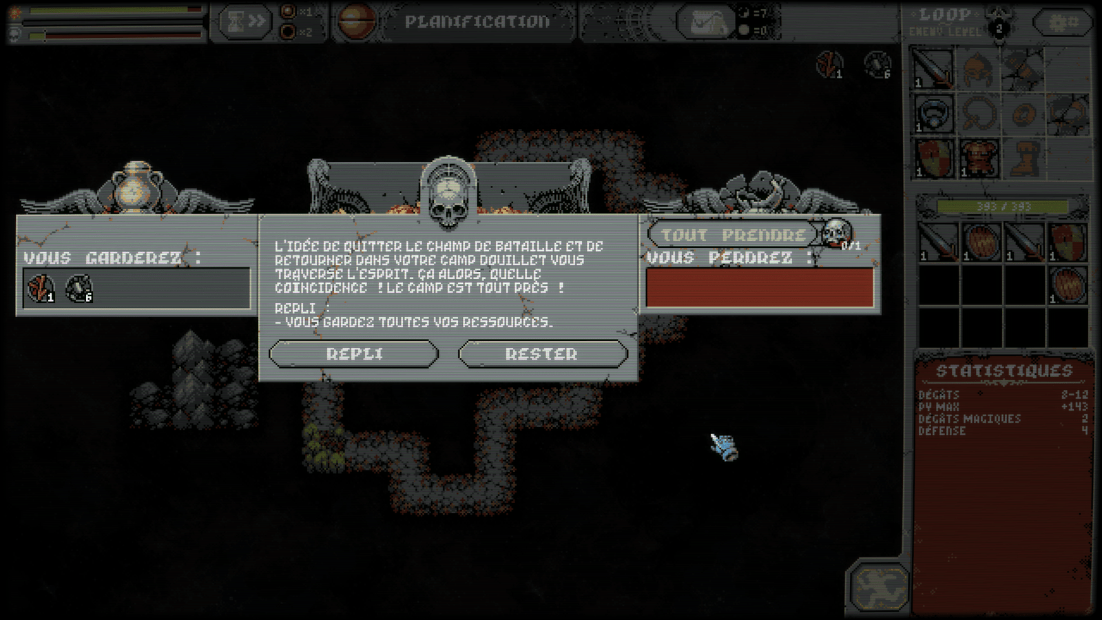 La perte d’équipement et de matières premières laisse un goût amer et caractéristique lorsque l’on cherche à pousser la boucle trop loin, mettant la mécanique du « Stop ou encore » au cœur de l’expérience. Loop Hero oblige à la vigilance, et récompense la prudence en permettant au joueur se repliant de son plein gré d’une série de boucles trop ardues de conserver tout ce qu’il a amassé dans son périple. En revenant au camp, le joueur chargé de bricoles et de bouts de bois va pouvoir construire différents bâtiments qui faciliteront ses prochaines aventures en permettant d’emporter de l’équipement supplémentaire, de remplir des potions, d’augmenter ses statistiques ou bien en ajoutant de nouvelles cartes – forêt, village, tour de guet – à choisir au moment de constituer le paquet de départ. Trois classes de héros peuvent également être obtenues et apportent suffisamment de variété dans la préparation des parties, le déroulement des combats ou l’obtention de matériel.