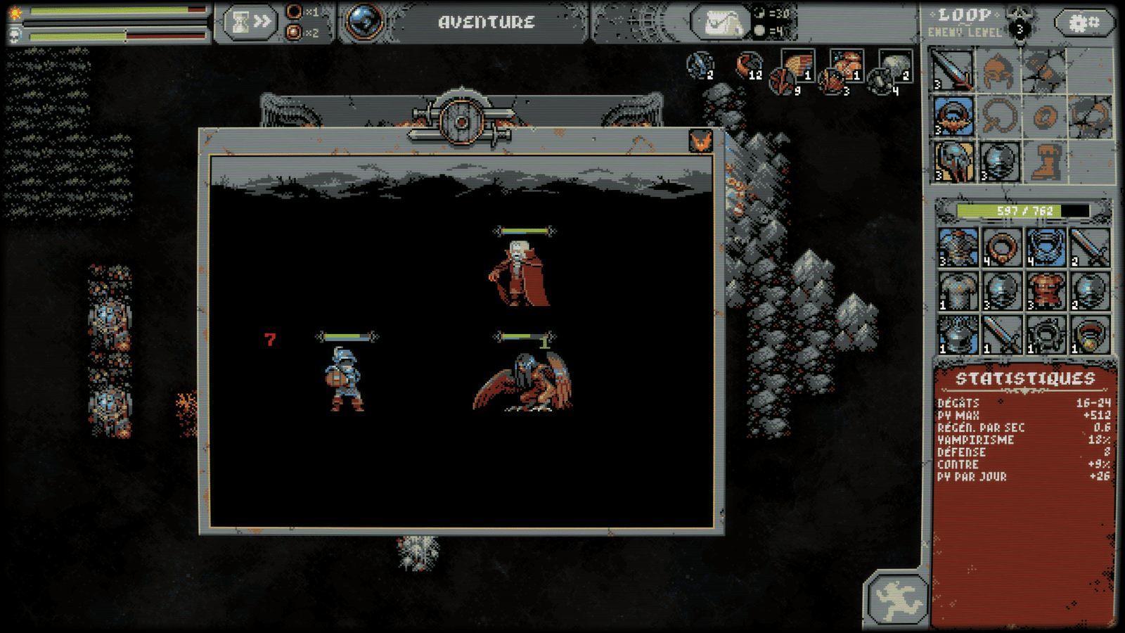 Si le petit personnage casqué tourne en rond sur ce chemin, vous décidez néanmoins de ce qu’il va rencontrer, en jouant des cartes comme des tuiles de jeu de société, sur le bord de la route, autour du chemin ou même directement sous les pas du héros. Jouer une carte, c’est planter une prairie, ériger une montagne, faire sortir de terre un bosquet intriguant, et ainsi procurer différents bonus au héros, à intervalles réguliers. Loop hero divise son unité de temps en jours, signalés par un cocorico enroué, et le personnage voit remonter ses points de vie à chaque lever du soleil, mais aussi surgir rats, loups, vampires et squelettes au même rythme journalier. Ajouter un cimetière sur le chemin permet d’obtenir des matières premières – dont l’importance vous est décrite plus bas -, mais c’est aussi l’assurance de devoir y affronter un sac d’os armé d’une épée à chaque fois que l’on passe sur la case. Les cartes sont des bonus et font progresser le héros, mais sont aussi annonciatrices de dangers futurs, qu’il faut recroiser à chaque boucle effectuée, obligeant le joueur à bien penser leur placement et à ne pas tout poser sans réfléchir, au risque de rendre l’aventure trop complexe à chaque nouveau jour pour notre petit protégé. La complexité arrive bien assez tôt d’ailleurs, en même temps que le boss de fin de chapitre – invoqué au bout d’un certain nombre de cartes posées – écrase l’aventurier et renvoie tout ce petit monde de pixels au début d’une nouvelle boucle à reconstruire.