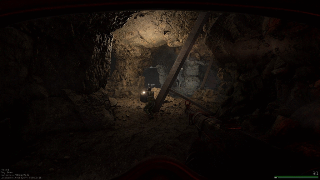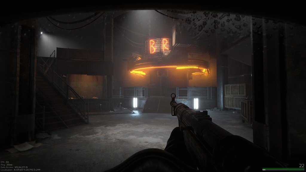Un point qui fera peut-être bouder les plus militaro-sexuel d’entre vous : Le système d’armes est très basique. On se retrouve avec beaucoup d’armes de la Seconde Guerre mondiale aux améliorations et à la customisation très chiches. Mais c’est lié au gameplayOu « jouabilité » en français, fait référence à la façon dont le joueur interagit avec un jeu vidéo., très brut de décoffrage. Le jeu souhaite nous faire sentir comme les derniers rats de l’espace, se débrouillant avec ce qu’il trouve pour être efficace. On le ressent presque dans les déplacements, un peu « cassé » : tout n’est pas ultra-fluide malgré la présence d’un système de vault pour venir à bout des barrières et autres obstacles de moins d’1m50. Notre personnage aura tendance à se mouvoir comme si ses bottes étaient en plomb. Mais si ces problèmes de déplacements peuvent être une intention, la spatialisation, elle, doit être rapidement réglée. Capitale dans ce genre de jeu, elle peut vous fournir de précieuses informations pour engager un combat. Mais ici, même avec un réglage précis de mon Dolby Atmos, les bruits en dessous/au-dessus sonneront comme s’ils étaient derrière vous. Autant dire que j’ai tapé toutes sortes de crises de panique inutiles suivies (souvent) d’une mort bête.