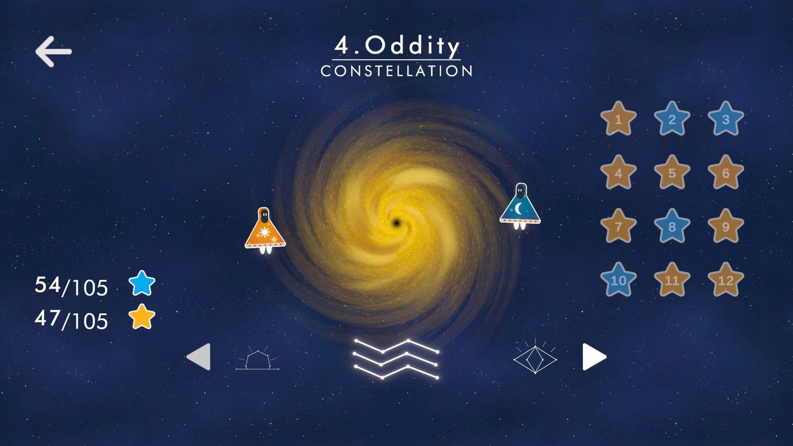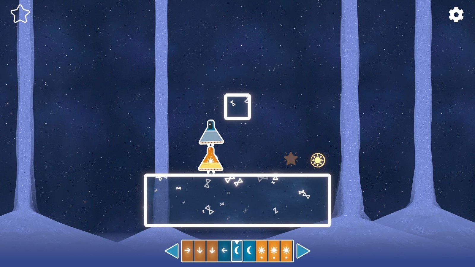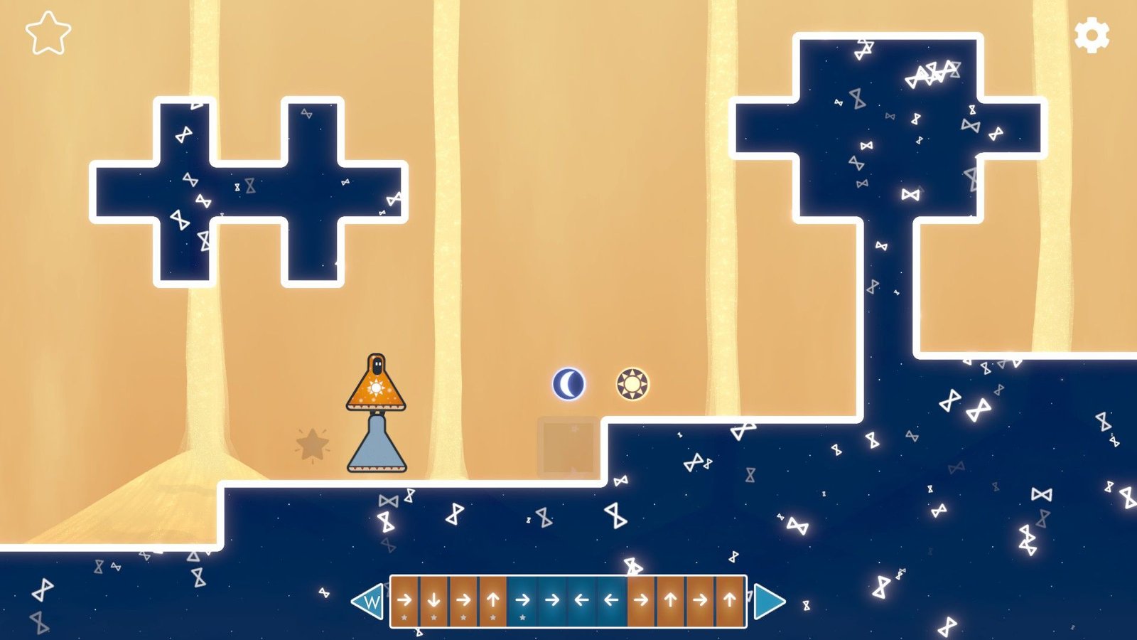 Le problème, s’il vient en grande majeure partie du joueur, pour celui-ci vient aussi du jeu. Le principe est ici très simple, mais très complexe à expliquer (la vidéo ci-dessus va clairement vous servir pour comprendre le propos du jeu). On y contrôle deux personnages, l’un qui représente le soleil, et ne se déplace que de jour, et le second, la lune, qui lui ne se déplace que la nuit, dont on retrouve la barre d’action en bas. L’objectif est d’amener chacun de ses personnages sur leur symbole avec le nombre de mouvements donné. Petite subtilité, lorsque la nuit tombe, soleil refait ses mouvements à l’envers, et lune retourne à son point de départ et exécute ses mouvements dans l’ordre (à condition que ce dernier ait au moins deux phases de mouvement).