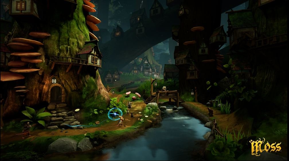 Voilà qui mène à un rendu incomparable, dont on ne peut se rendre compte en regardant les trailers et screenshots, « à plat ». Ces images ne rendent pas justice à la qualité graphique du jeu, le passage en réalité virtuelle donnant une dimension toute autre, encore renforcée par la qualité d’animation de Quill, et par le contexte même de Moss, qui permet de jouer sur deux échelles : au monde à taille de souris ( qui rappellera le jeu de plateau Mice & Mystics ), s’ajoute le monde « réel », celui qui serait foulé par les humains. Ce cadre supérieur, qui n’apparaît ici que comme élément de décor, encapsule le joueur dans un gigantisme impressionnant ; l’arrière-plan, où apparaissent des biches, ou des vestiges d’une bataille, participe à l’ambiance, à l’immersion, à la magie de ce monde virtuel. Chaque tableau est alors un nouvel émerveillement, la qualité des détails et des lumières frappant immanquablement, de même que celle des effets de profondeur. Moss est tout simplement perpétuellement magnifique .