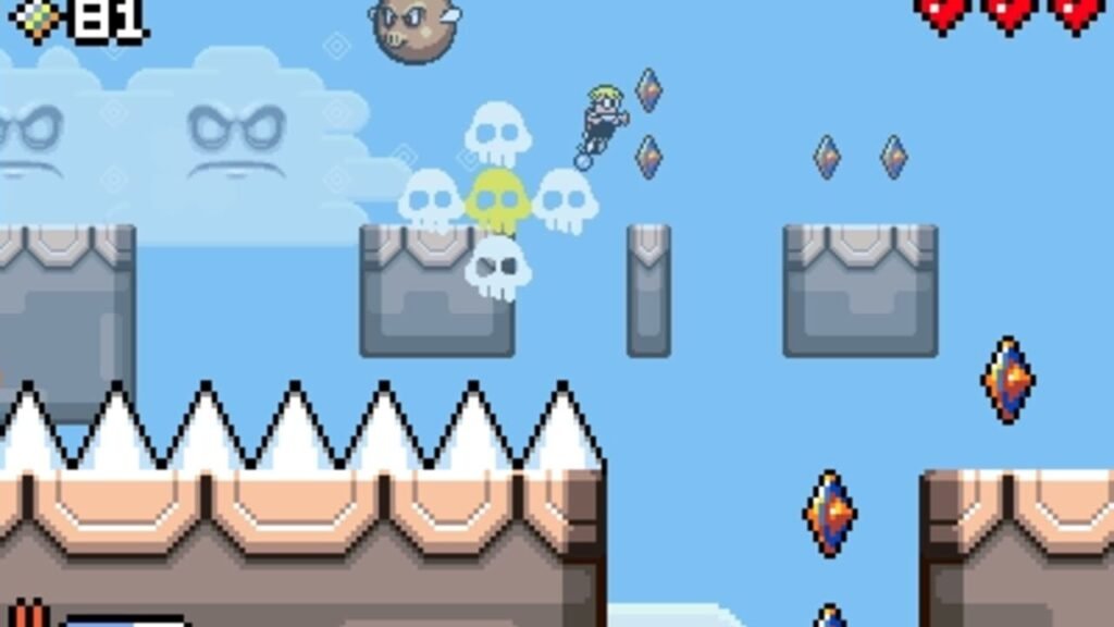Absolument aucun coeur n’est récupérable en plein coeur de ce même niveau et il faut donc bien jouer, ce qui est d’ailleurs au coeur du gameplayOu « jouabilité » en français, fait référence à la façon dont le joueur interagit avec un jeu vidéo. de Mutant Mudds. Un relief utile et de qualité ! Le passage de la 2D à la 3D via le petit switch de la Nintendo 3DS ne fait aucun doute : Mutant Mudds se doit d’être joué avec l’effet relief activé. Trois plans de profondeurs sont proposés, qui se mélangent bien trop sans l’option activée. Des ennemis sautent aussi du premier au second plan pour vous frapper et les trompe-l’oeil sont très nombreux. Bref, le relief est utile et donne au jeu une atmosphère tout à fait originale et percutante. Pourtant, il est assez basique ce Mutant Mudds. Chacun des quinze niveaux possèdent trois joyaux à débloquer : un en le finissant, l’autre en obtenant les 100 pièces du parcours et un troisième joyau en découvrant l’entrée secrète et parvenant à la fin du niveau caché (qui ne contient pas de pièces mais un défi davantage corsé, sur un fond rouge et noir rappelant fortement la faitgue visuelle provoquée par l’ancestrale Virtual Boy de Nintendo) .