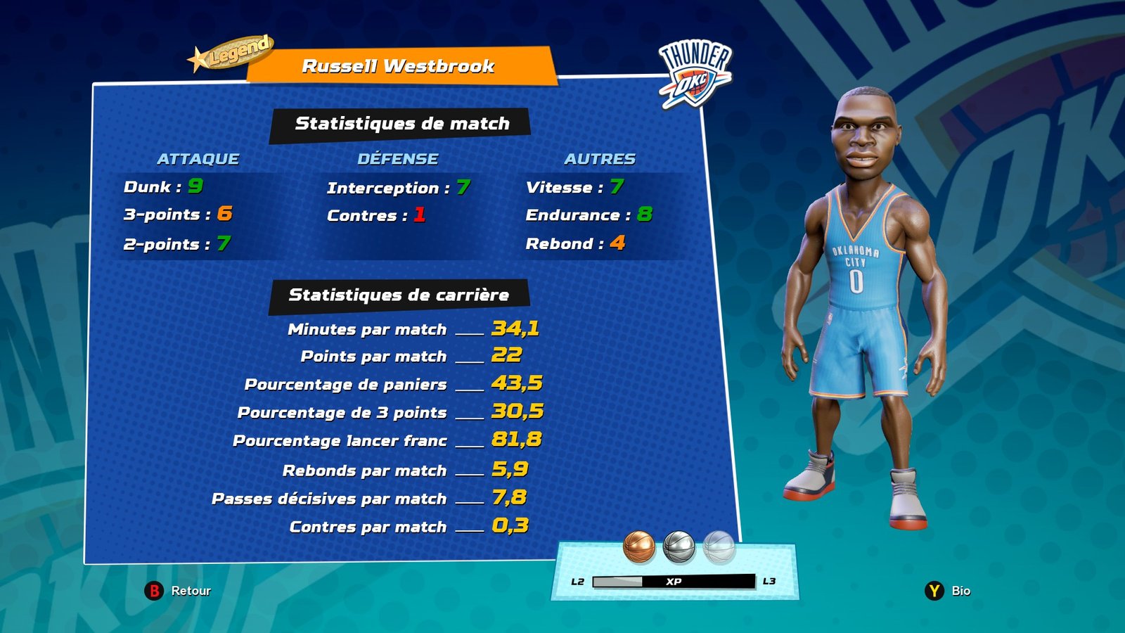 Votre niveau de joueur augmentera également et à chaque palier, vous débloquerez un booster de cartes joueurs . Vous l’aurez compris, ces cartes permettent de grossir votre collection de basketteurs disponibles. Chacun a ses propres statistiques ainsi qu’une rareté. Dans les légendes vous retrouverez des joueurs mythiques ( Magic Johnson, Shaquille O’Neal, Scottie Peppen… non toujours pas Michael Jordan ) ainsi que des récents mais déjà incroyables comme LeBron James par exemple. Chose plutôt sympa, une petite bio accompagne chaque basketteur pour mettre en avant ses exploits ( meilleur dunker de l’histoire de la NBA, sélectionné x fois en All-Star… ). Le système fonctionne bien, mais vous ne pourrez probablement pas composer le duo de vos rêves rapidement .