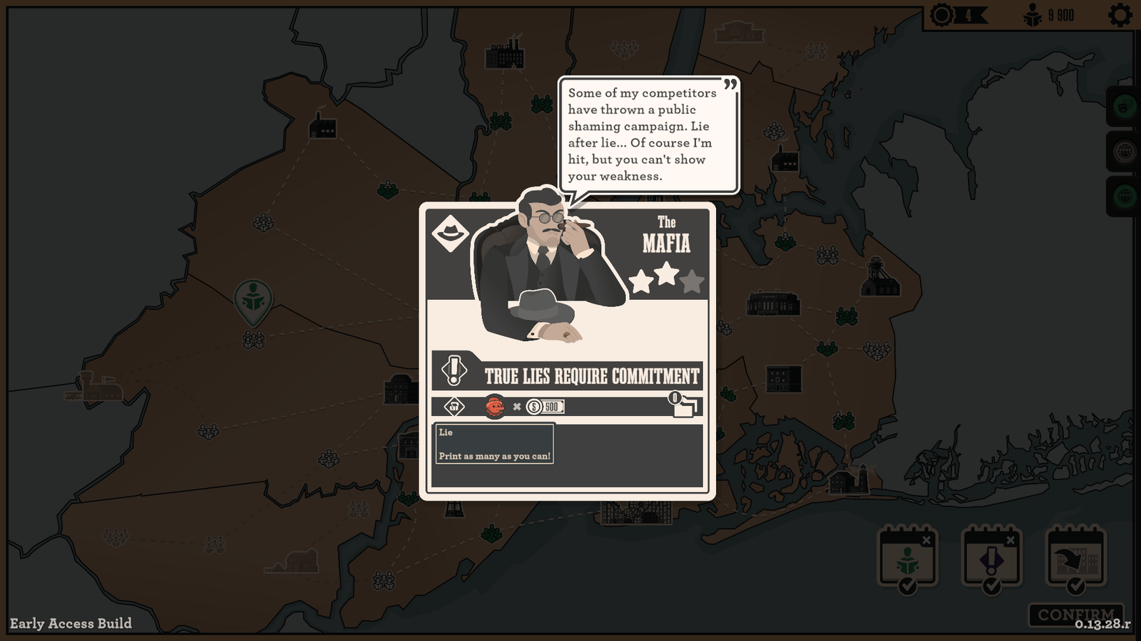 Vous choisirez également chaque semaine un nouveau quartier de New York à conquérir qui vous réclamera des mots-clés spécifiques, des passionnés d’économie de Wall Street aux hippies culturels de Broadway. Rajoutez aussi la possibilité d’abandonner votre conscience professionnelle en suivant les directives d’une des trois factions disponibles (le Maire, la Mafia ou la Haute Société) qui vous censureront ou à l’inverse sponsoriseront certains mots-clés. Enfin, tout ce petit monde vous donnera si satisfait des points d’influence qui vous serviront à équiper votre rédaction en nouveaux objets ou postes (une nouvelle page pour votre journal ou un énième type de plante verte, bureaulogie quand tu nous tiens…), et rebelote.