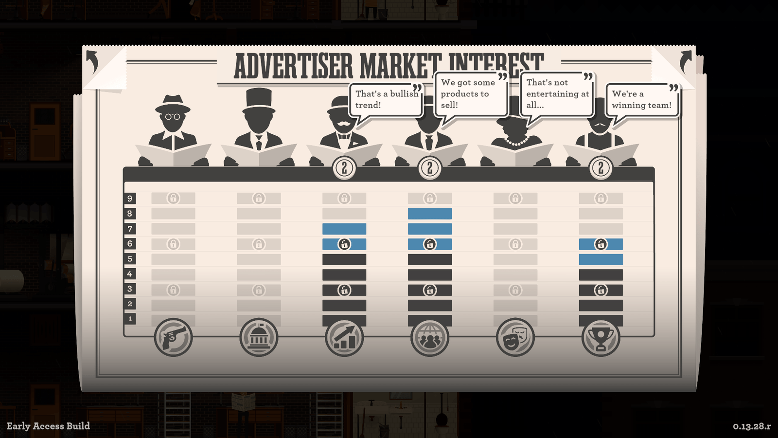 Chaque reporter possède par exemple trois spécialités (sport, politique, économie, etc) que vous pouvez booster en ajoutant des accessoires sur leur bureau (gants de boxe, carte des USA et calculatrice). Attention, les emplacements étant limités, impossible de créer des grosbills de l’information « experts en tout », oubliez votre rêve d’un BFM des années 30.