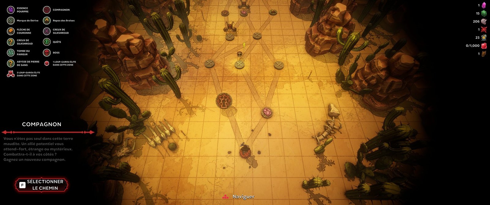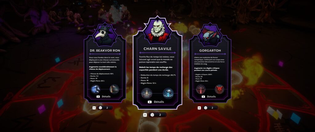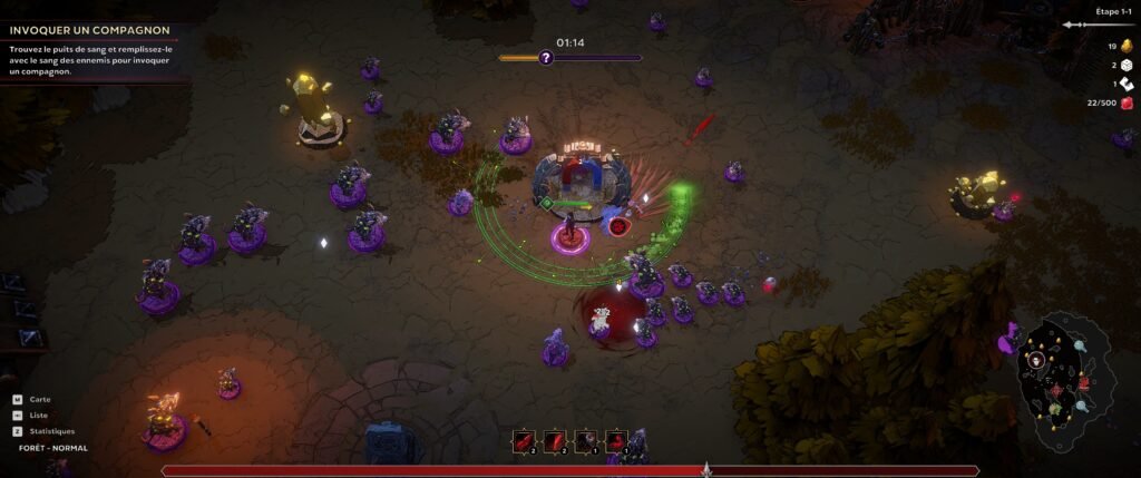 Vous jouez un seigneur de l’ombre revenant à la vie pour purifier le monde des loups-garous et obtenir des ténèbres un peu moins chaotiques. Pour cela, il va falloir parcourir une grande carte façon rogue-like classique, enchaînant les situations : purifier une zone, survivre assez longtemps, obtenir certains objets ou vaincre des boss. La routine. Tout cela se fait cependant sous forme de petites sessions de 5 minutes de Vampire Survivors-like.