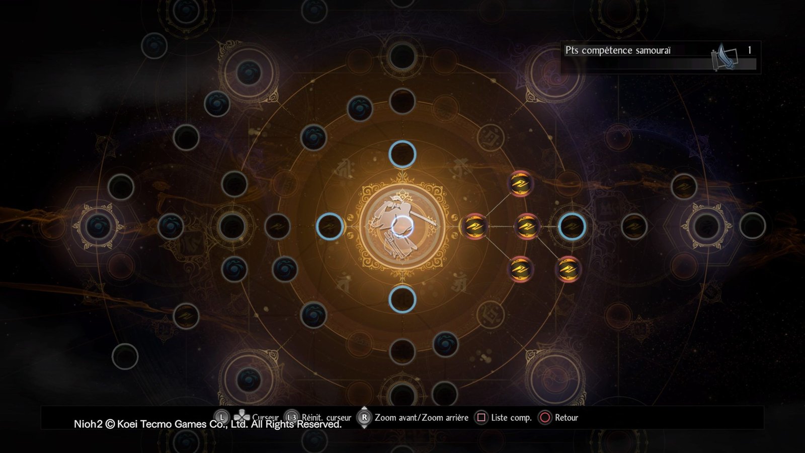 Afin de se défendre, il est possible de récupérer des armes diverses, allant de l’évident katana au « glaive » une espèce de faux amovible faisant furieusement penser au couperet-scie de Bloodborne. Tonfas, lance, double hachette, tout ce qui frappe, cogne, découpe, scie, perce, vous l’avez à disposition. Chaque arme dispose en plus de son propre arbre de compétence, dont la progression est indépendante de l’expérience accumulée en combattant des monstres, donc libre à vous d’expérimenter, tout en sachant que les dégâts des armes sont liés à une ou deux caractéristiques précises, donc attention où vous mettez vos points quand même. En plus des compétences de bagarre, on débloque des points dans quatre autres arbres de compétence : Samouraï, Ninja, Hybride et Mage Onmyo. Le ninja et le mage permettent d’utiliser de la magie (boule de feu, buffs et débuffs, etc.) ou des outils de ninja (Discrétion, assassinat, shurikens, etc. Mais pas question de lancer un grappin et courir sur les murs, on reste désespéramment cloué au sol). Le samouraï permet d’améliorer la mobilité globale du personnage et Hybride, hum…