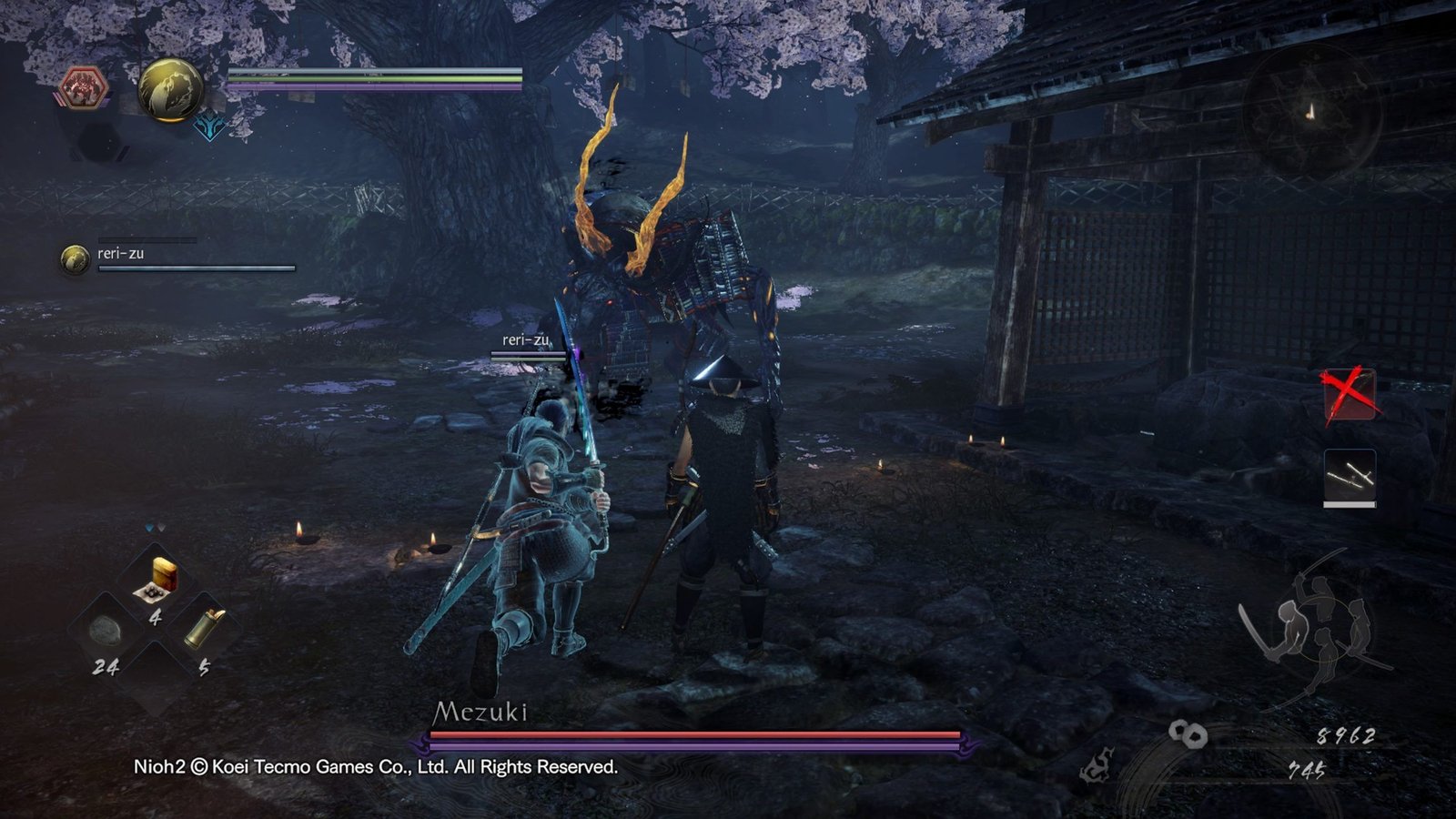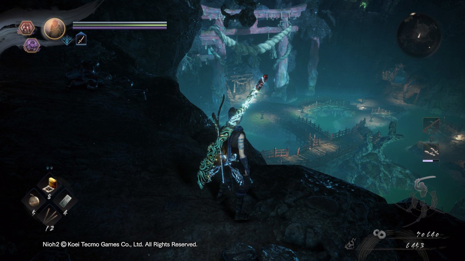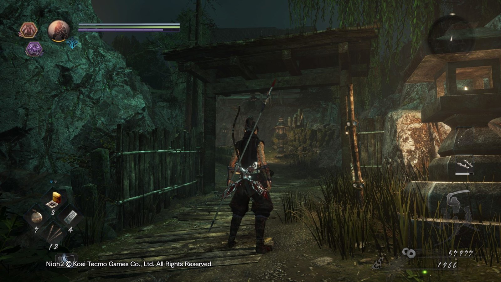 Les niveaux traversés sont la plupart du temps plutôt beaux et intéressants à explorer (faut aimer les forêts mystiques, les temples et les villages en feu), mais on sent que l’équipe a manqué un peu d’inspiration, allant jusqu’à reprendre des pans entiers du premier jeu par endroits. Le bestiaire est assez varié et va chercher dans tout ce que le Japon connaît comme bébêtes magiques, monstres divers ou personnifications d’objets du quotidien (craignez les roues en feu), on y affronte aussi des humains « normaux ». Graphiquement le jeu est plutôt beau et coloré (ce qui change des Dark Souls, faut avouer), et on a le choix entre trois modes de jeu, comme dans le premier : plus joli mais en 30 images secondes, moins joli mais en 60 images secondes, et un mode dynamique un peu déroutant. L’ambiance sonore est à l’avenant, avec des musiques épiques quand il faut, et des bruitages percutants. Techniquement c’est plutôt réussi.