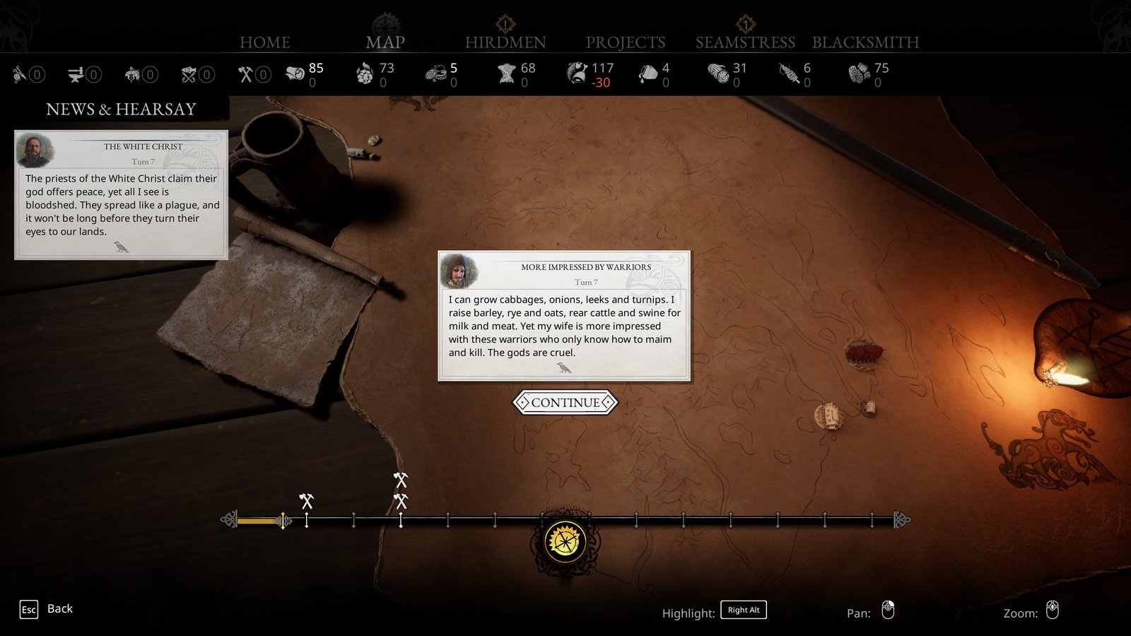 Côté gestion, l’ensemble reste assez superficiel. On construit des bâtiments à partir de ressources récoltées en mission, produites par certains métiers ou obtenues via le troc avec les villages voisins. Les constructions prennent plusieurs tours de jeu pour être complétées, et les tours s’accompagnent d’événements narratifs donnant accès à de nouvelles missions ainsi qu’à quelques infos et anecdotes sur ce qu’il se passe dans notre village. Améliorer certains bâtiments va permettre de fabriquer de l’équipement plus puissant pour ses combattants ou encore permettre de recueillir un nombre de guerriers plus élevé. Dans les faits, ce n’est pas vraiment utile, vu qu’il est tout à fait possible d’envoyer tout le temps la même équipe sur le terrain au vu de la faible difficulté. Si ces systèmes fonctionnent, ils manquent d’impact réel.