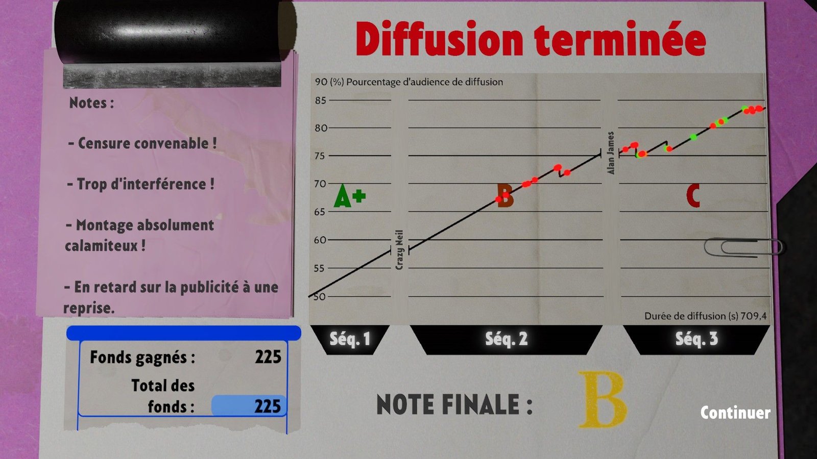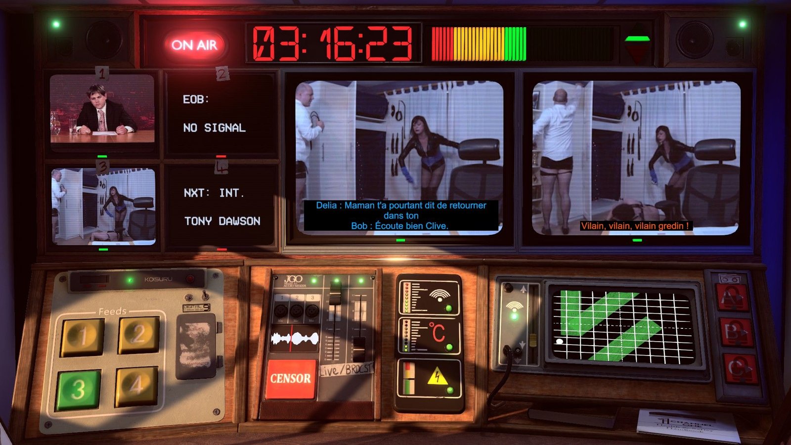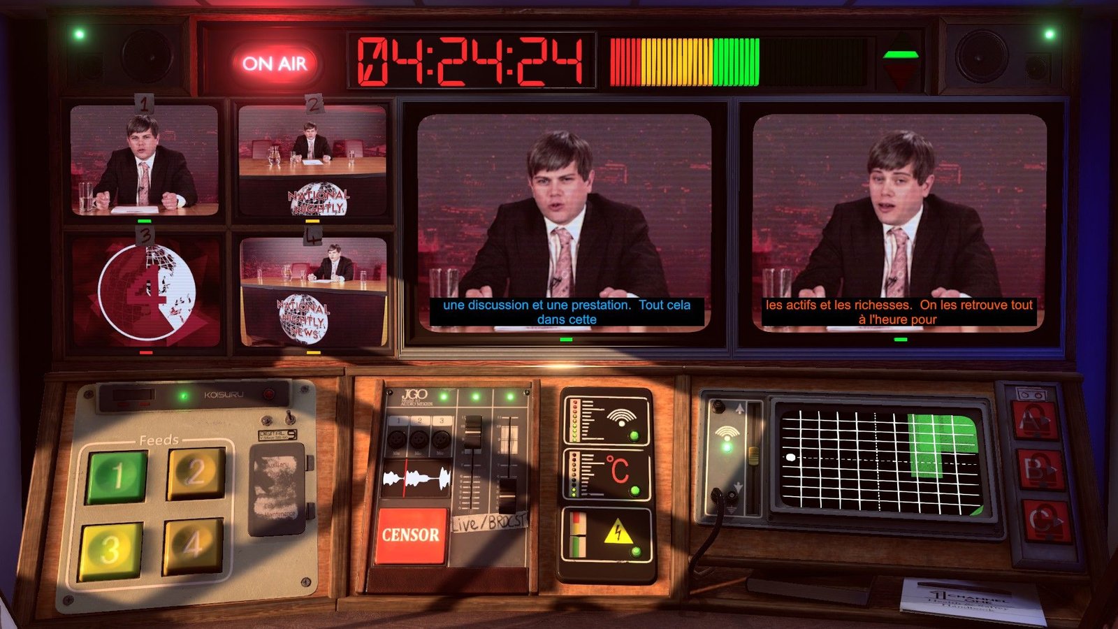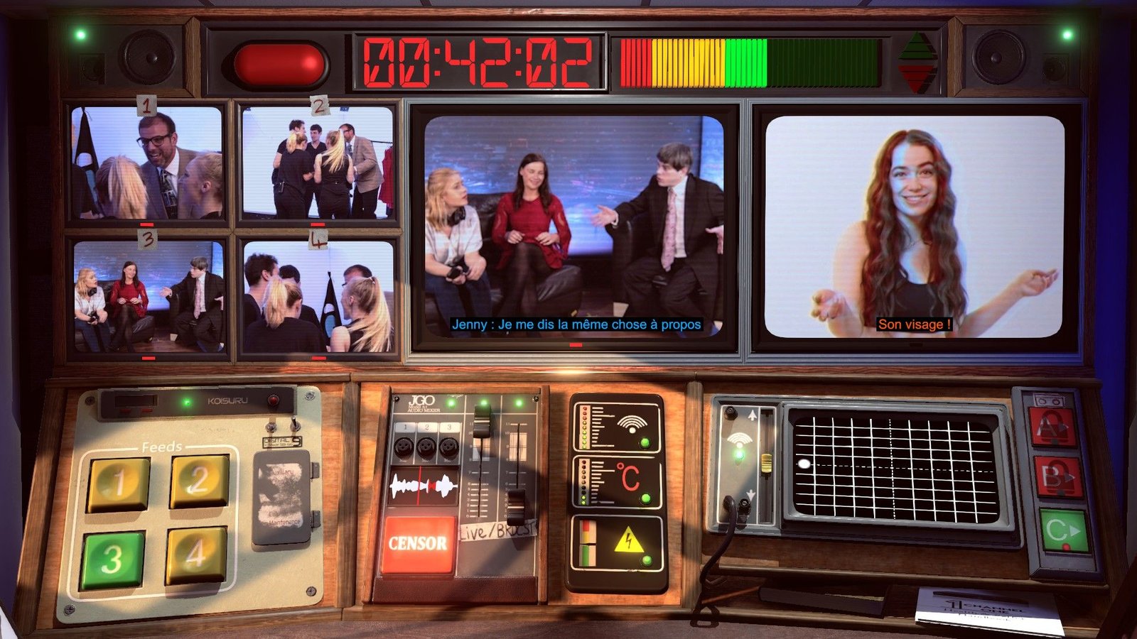 Vous mettez quelques cassettes VHS de publicités dans les trois lecteurs associés pour les coupures entre deux sujets, puis c’est le temps du direct. Au bon timing, vous placez votre infâme présentateur phare au centre de l’attention. Quatre écrans pour quatre propositions de direct sont affichés sur votre poste de commande, en plus de deux larges diffusions : le direct, mais surtout le différé qui permet de mieux contrôler ce bazar que vous espérerez rapidement gérer d’une main de maître.