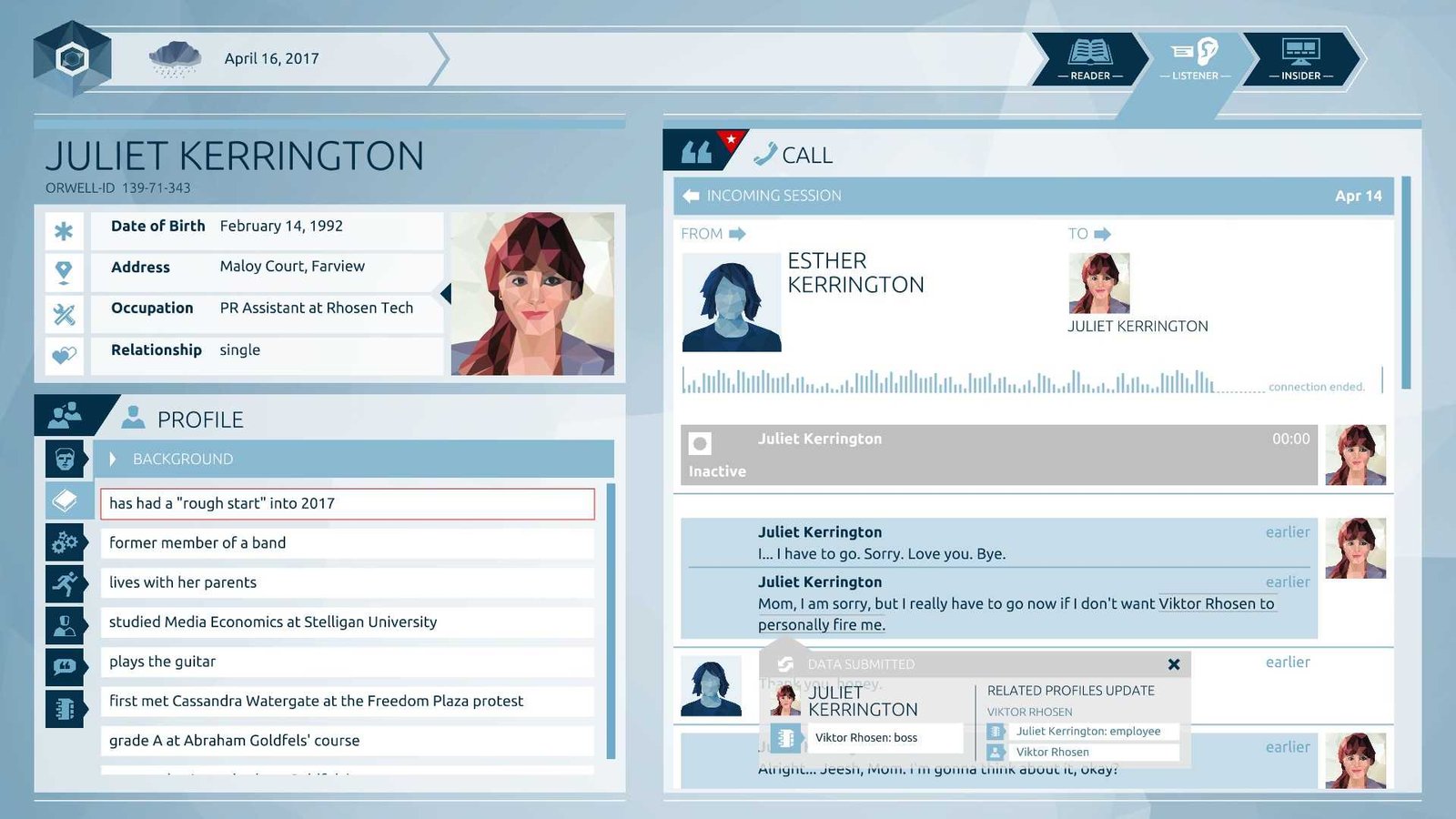 Il y a dans Orwell un véritable sentiment d’enquêter, de progresser dans la connaissance des faits en tâtonnant, en sélectionnant les informations pertinentes . En cela, il se rapproche de Her Story , en étant toutefois beaucoup moins libre et beaucoup plus linéaire. Tout le propos du jeu est de mettre en balance les enjeux sécuritaires ( une bombe a explosé, et d’autres sont à venir, qu’il faut absolument prévenir ) et les enjeux de liberté : l’on peut accéder, tout à fait légalement, à l’intimité de chacun. Et le joueur-Big Brother de juger les gens qu’il épie, de les cataloguer criminels en puissance s’il en a envie. Pour quelles conséquences ? Et s’il se produisait un fait tragique ? Si l’étiquette « dangereux » devait amener à une catastrophe, n’y serait-on pas pour quelque chose ?